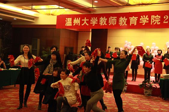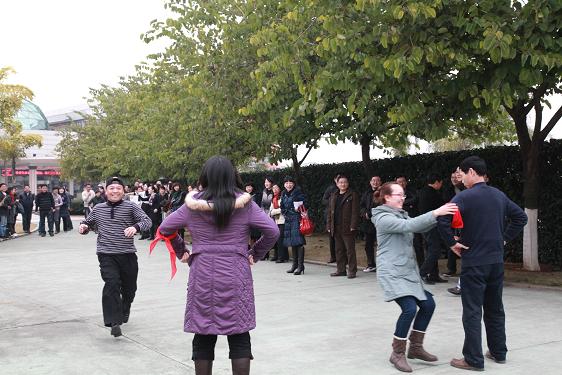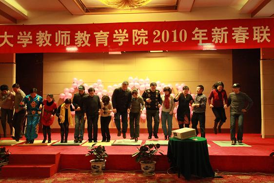 在联欢会开始前,所有到场的教职工一起来到酒店外进行“系红领巾”的游戏,每个部门各出8名教师结组参赛,活动现场既紧张激烈,又轻松搞笑,比赛高潮要算实验教学中心和小学教育系的终极PK,最终由实验中心夺得了比赛的冠军。
