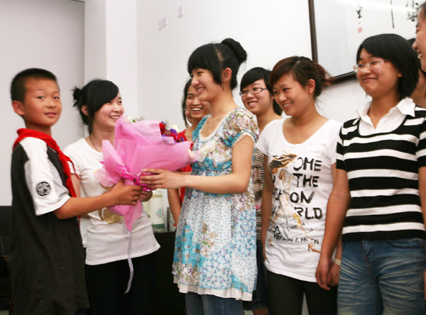 当天晚上的座谈会上,爱心家教服务对象雷宁小同学也应邀请前来参加,他为自己的家教老师周晓微同学献上一束美丽的鲜花,他说:最美的鲜花要献给最美的老师(如图)。财神捕鱼 教师财神捕鱼 党委副书记嵇小怡老师在座谈会上指出,爱心家教活动对大学生的成长成才具有积极作用,财神捕鱼 将坚持把爱心家教工作做下去争取更好的成绩。(章志图/文 翁卿仑/摄)