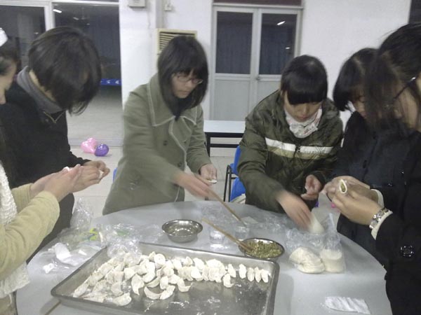 活动现场气氛温馨,一排男生还自觉在门口当起了“迎宾先生”,他们彬彬有礼的举止逗乐了大家,在笑语盈盈着,大家围坐在摆满瓜果的圆桌上自由交流。而在厨房中忙碌的同学,递菜的递菜,切菜的切菜,在食堂师傅的帮助下热火朝天的包起了汤圆与饺子。在焦急的等待中,第一锅饺子终于热气腾腾地出炉了,辅导员与学生干部们一哄而上,一抢而光。学生科长章志图老师戏言:“我们学生干部战斗力还是蛮强的!”随着一锅锅饺子的出炉,大家尽情的开吃,尽情的玩游戏,在轻松的交流中,大家暂时忘却工作的压力与学习的紧张。