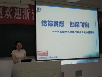 5月29日上午,浙江省大学生多媒体作品设计竞赛办公室主任,浙江师范大学章苏静教授应邀来校作“大学生多媒体作品设计竞赛指导”讲座。参加讲座的来自教育技术学、广告学、艺术设计专业的竞赛指导教师以及60多位学生。讲座由财神捕鱼