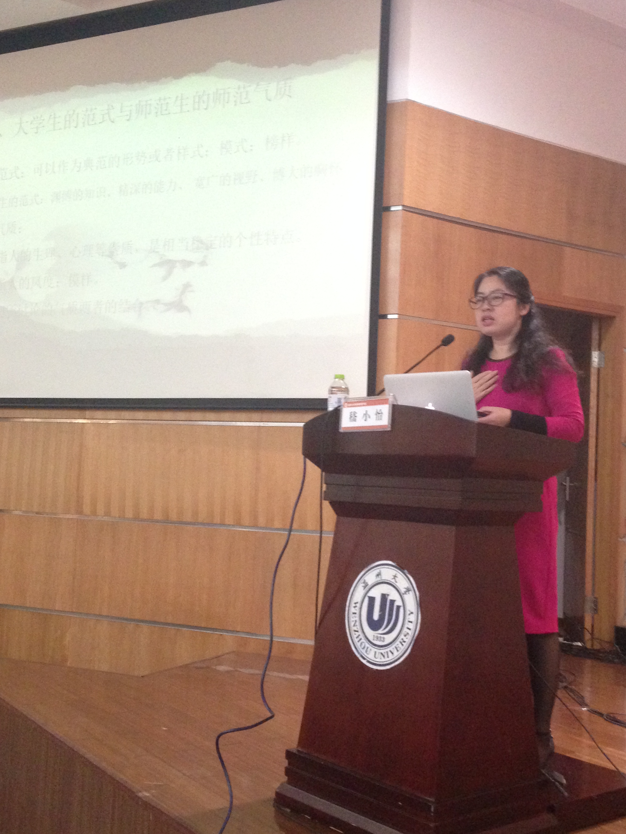 党总支副书记嵇小怡老师为在座的师生带来微讲座“美丽青春行、幸福教师梦——师范气质之自我修炼”。嵇老师指出,气质是一个人从内到外的一种内在的人格魅力,是长久的内在修养平衡以及文化修养的一种结合,是持之以恒的结果。而我们师范生特有的“师范气质”就是我们在专业教育与培训基础上形成的,明显而又独特的教师专业素养和职业倾向性的外在显现。作为一名师范生,我们要努力提升自身的内在修养和文化修养,专研性地学习专业知识,适当性地选择干部历练,选择性地参加社会活动,坚持性地训练师范技能,不断性地阅读各类书籍,用知识武装自己,用运动磨练自己。最后,嵇老师对我们提出了以下期望:塑造师范气质,实践美丽青春行;展现教师风采,实现幸福教师梦!嵇老师慷慨激昂、热情洋溢的号召赢得了在场同学们一片掌声。