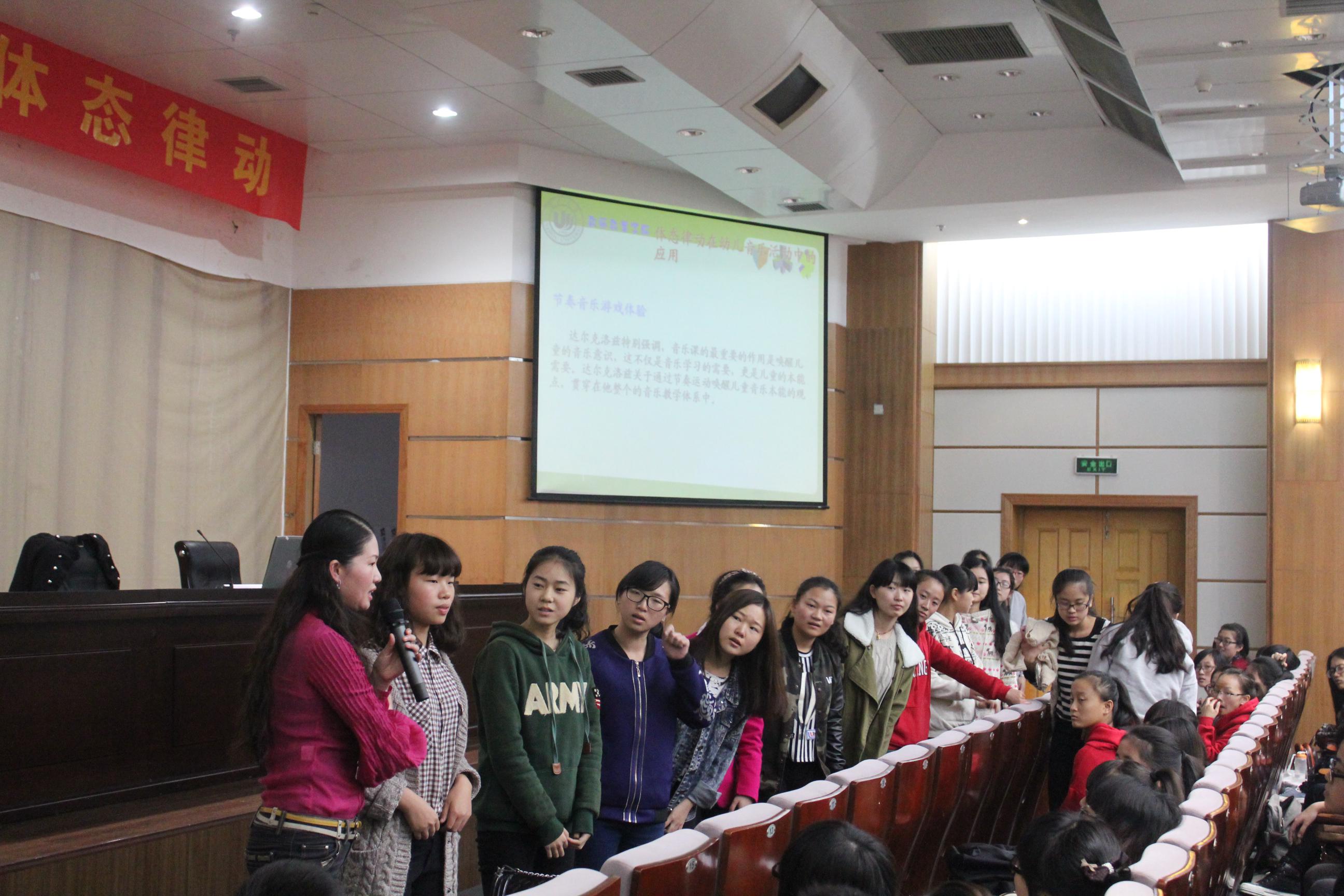 讲座中,陈恩清老师把体态律动教学法在未来的幼儿教师中进行了普及,并用三个体态律动的节奏活动与全场同学们一起做游戏练习。讲座就在同学们随着音乐节奏摆动的欢乐中落下帷幕。体态律动,舞出音乐的节奏,舞出孩子的创造!