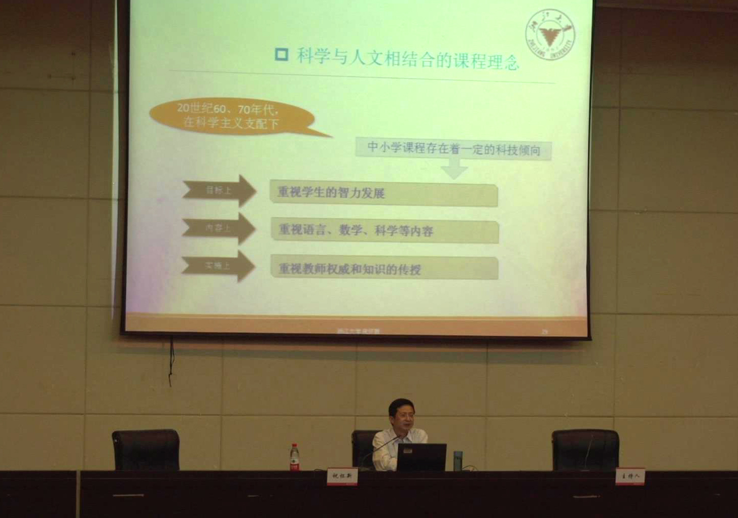 师范类专业师生作题为“欧美基础教育的改革与发展”的专题报告。祝教授从当代基础教育的发展背景谈起,用比较教育的视角为大家简要讲述了美国国家教育目标和我国国家教育事业发展十二五规划,深入阐述了以皮亚杰的认知发展观为主要代表的建构主义理论及其对当代基础教育产生的深远影响。比较全面地介绍了在建构主义理论指导下形成的全人教育课程价值取向、科学与人文相结合的课程理念、回归生活的学生课程生态观等基础教育课程的基本理念,以及在此基础上形成的多模式、整合化的基础教育课程模式,强调了培养会思考的公民和有能力的劳动者是基础教育的重要目标。祝教授用渊博的知识、开阔的视野、比较的方法和深刻的见解,为大家深入浅出地介绍了欧美基础教育改革与发展的理论与实践,为教育专业的师生带来一场国际化的专业理论营养大餐。之后与师生的互动交流也十分活跃精彩,让师生开阔视野、受益良多。