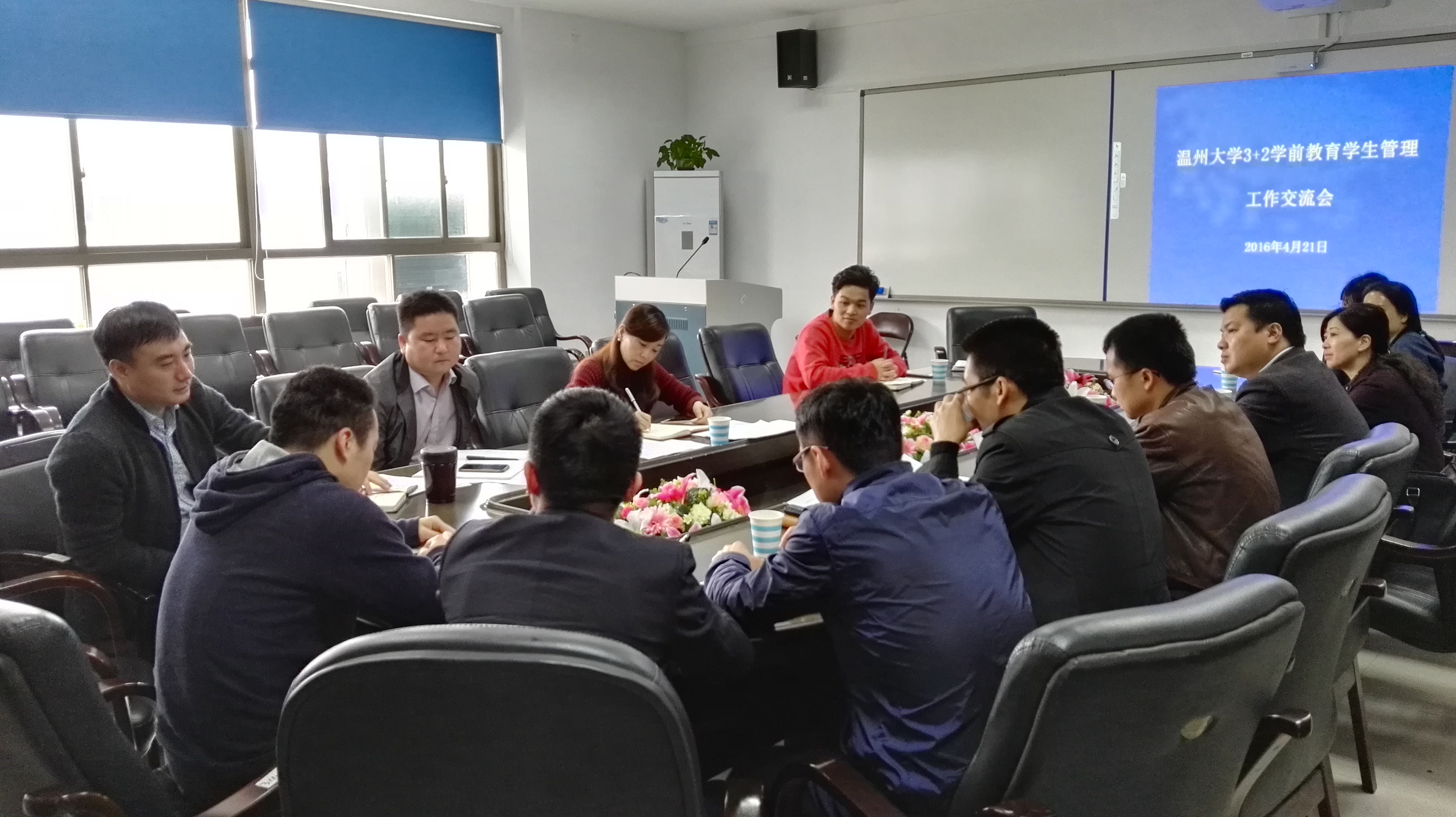 2016年4月21日上午,温州中等幼儿师范财神捕鱼 校长温州中等幼儿师范财神捕鱼 副校长侯伯念一行,温州市职业中等专业财神捕鱼 雷学远一行领导来财神捕鱼 开展财神捕鱼 3+2学前教育学生管理工作交流会。财神捕鱼 彭小明副院长,杨丽君副书记,溯初学区副主任、学区党总支副书记章志图,学前系班主任代表郑晓学生科辅导员严晓秋,邵胜男参加会议。会议由杨丽君副书记主持。