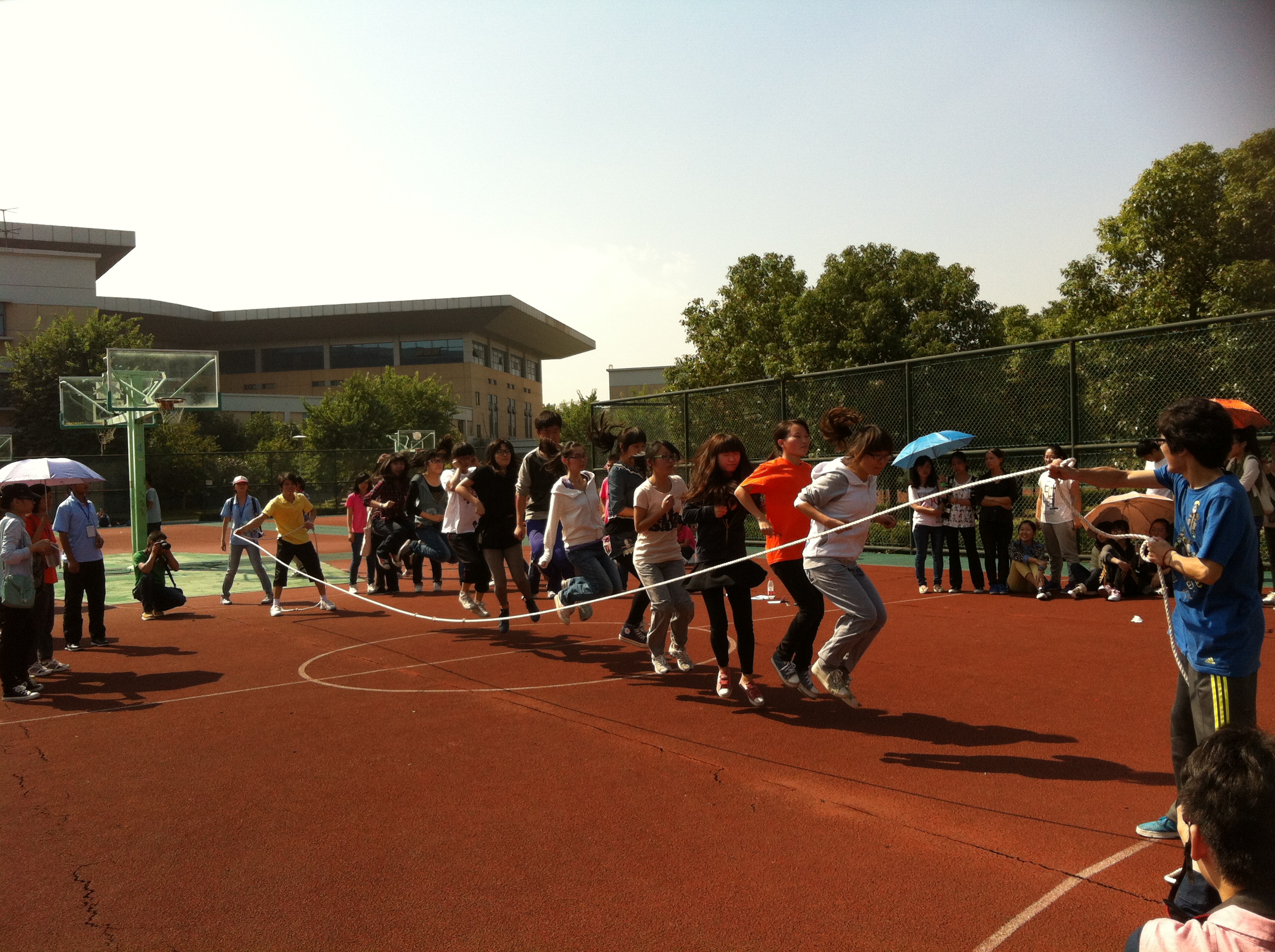 本次运动会,以班级为单位取团体总分前三名,分别有个人项目和团体项目,在团体项目中,主要有集体跳绳,两人三足接力,4*100接力等,而教工项目则包括了跳远、铅球、跳绳、两人三足、手足情深等项目。比赛期间那句“呦呦,教师教育最优秀”依旧成为了赛场上的最强音。教师财神捕鱼