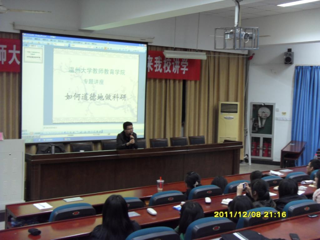 讲座开始,邓赐平教授首先做了《Early Assessment and Intervention of Children at Risk of Chinese Dyslexia》的学术报告,在报告中邓教授从语言和认知层面对儿童的阅读障碍进行了深入分析,并从这两个层面提出了评估策略。之后,邓教授也提出了“最科学的才是最道德的”这一观点并进行了具体阐释。报告结束,同学们积极踊跃的对相关问题提问并得到邓教授的解答指导。接下来讲学的是从事实验心理学研究30多年的乐竟泓教授,乐教授语言幽默风趣,形象生动,把晦涩难懂的心理学问题巧妙生动的予以解释,激发了同学们强烈的求知欲。同时,他也对心理学这么学科进行了全新的诠释并表达了自己的挚爱之情。最后,乐教授也对同学们学习心理学提出了要求,他说学生在校期间不应急功近利,要学好基础知识,打好进行心理学研究的基础。