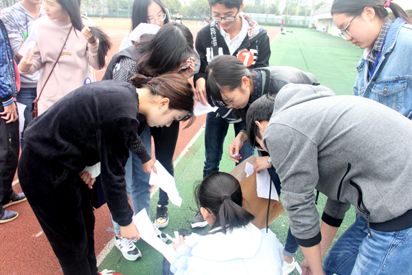 本次游戏地点共有八个,所有同学被随机分为11个小组,每一组路线的顺序都不一样。每个同学只有在到达相应地点并在该地点完成游戏后方可得到下一地点的提示,依次完成第二个到最后一个的任务。为了争取更早一点完成所有任务,同学们都使出了自己的洪荒之力。各个任务点都零星地散落在温大南北校区及大学生活动中心和图书馆的各个角落。比如在南9-A103的游戏为24点,工作人员将扑克随机放在课桌内或者地上,同学们抽取四张扑克并通过加减乘除得到24点即可,大家纷纷快速运转着自己的大脑,讲桌上的数字不断地拼拼凑凑,经过一番的计算,终于获得了成功。完成任务的同学开心地寻找各自的下一个地点。在南校的游戏还有西运动场的铁人三项游戏,共分为三个环节,分别是50米冲刺,大象抱自转5圈,最后要答对一题与文学知识相关的题目,同学们在转圈后依然努力完成了答题的环节,从中感受到了独有的乐趣。