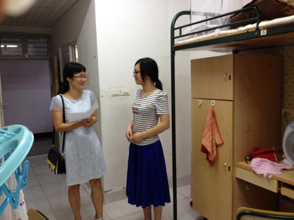 推开新生的寝室大门,老师们用和蔼的微笑迎接新生。面对新生们惊喜的目光,老师们亲切的问候:“你们的父母回去了吗?食堂的饭菜好吃吗?大学的生活还习惯吗?有什么问题需要帮忙解决吗?”令人惊喜的是新生们的适应性都很强,她们纷纷表示开学第一天的感觉还不错。新生们与老师们畅聊他们崭新的大学生活,并自信地表示自己会好好学习,决不懈怠。