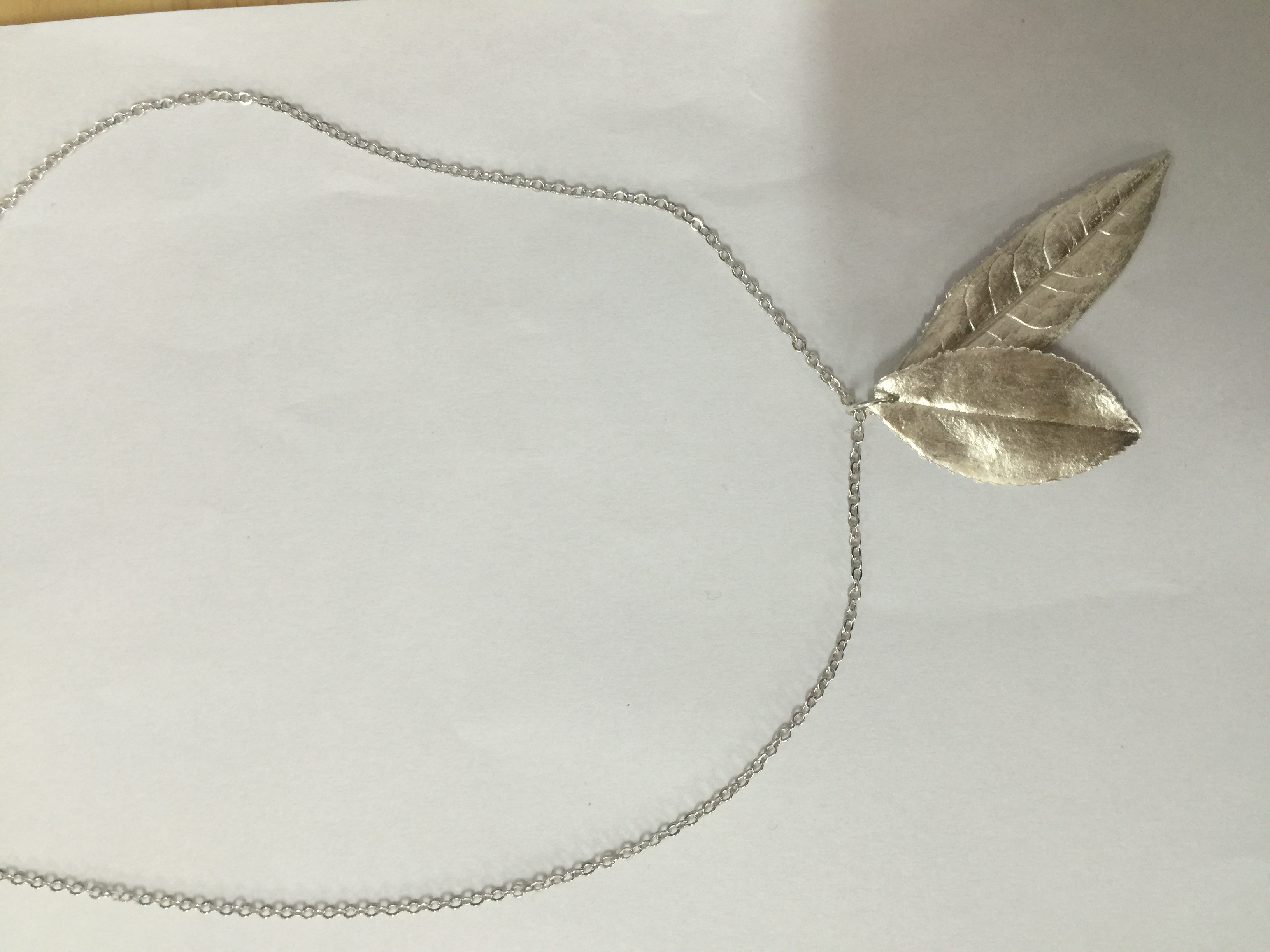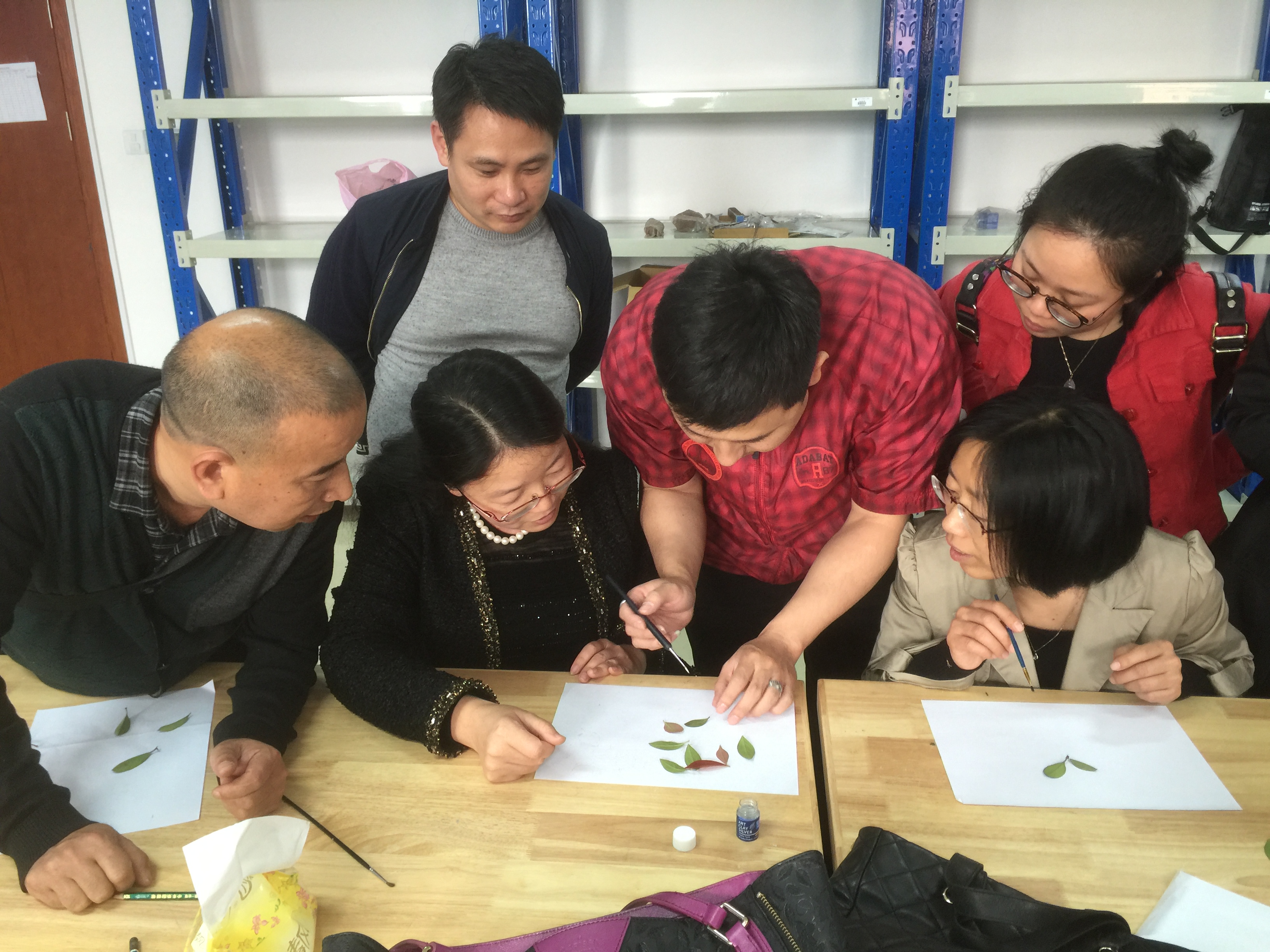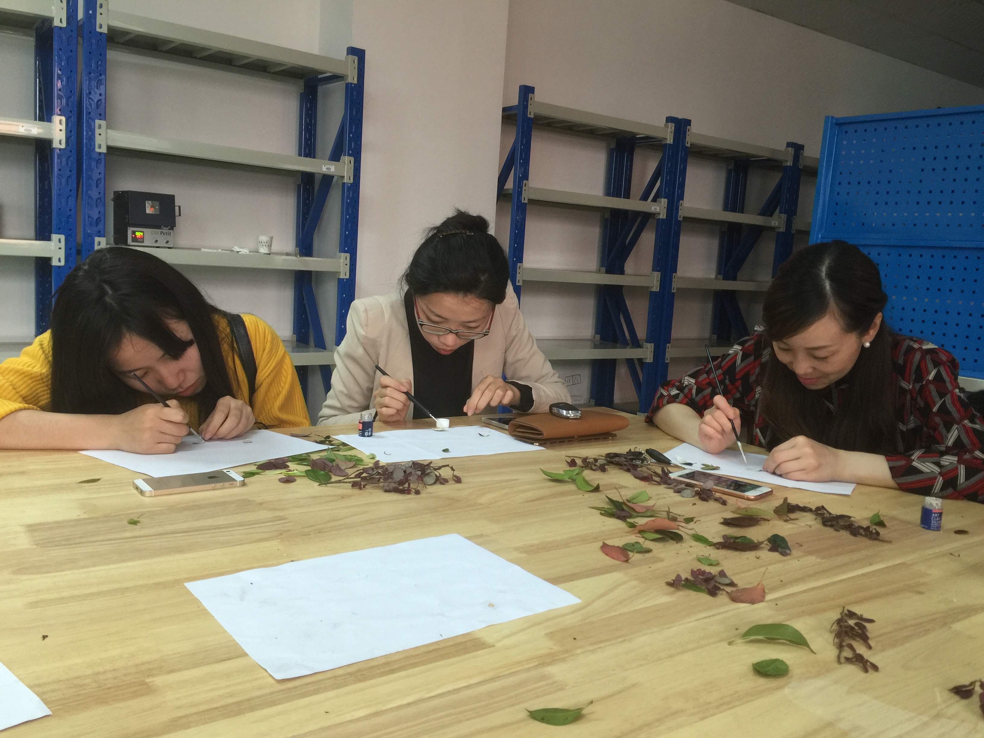 活动开始前,老师们纷纷在校园里采摘合适的树叶作为模具。这是银粘土饰品制作中较为入门级的做法,如果树叶纹路清晰、大小合适,制作出来的银挂件就像一张张漂亮的树叶。活动开始后,教职工们在专业老师的讲解和指导下开始了银饰的制作。先把银粘土液体均匀地刷在树叶的背面,待液体干了以后再刷第二层。如此刷上三、四遍,用吹风机吹干银液,就可放入快速烧结炉烧制了。在800度左右的高温下烧制大约5分钟,原来作为模具的叶子已经不见了,变成了一片片银树叶。再用刷子给银树叶进行抛光,然后钻孔、用银链子穿好,一件精美的银项链就做好了!