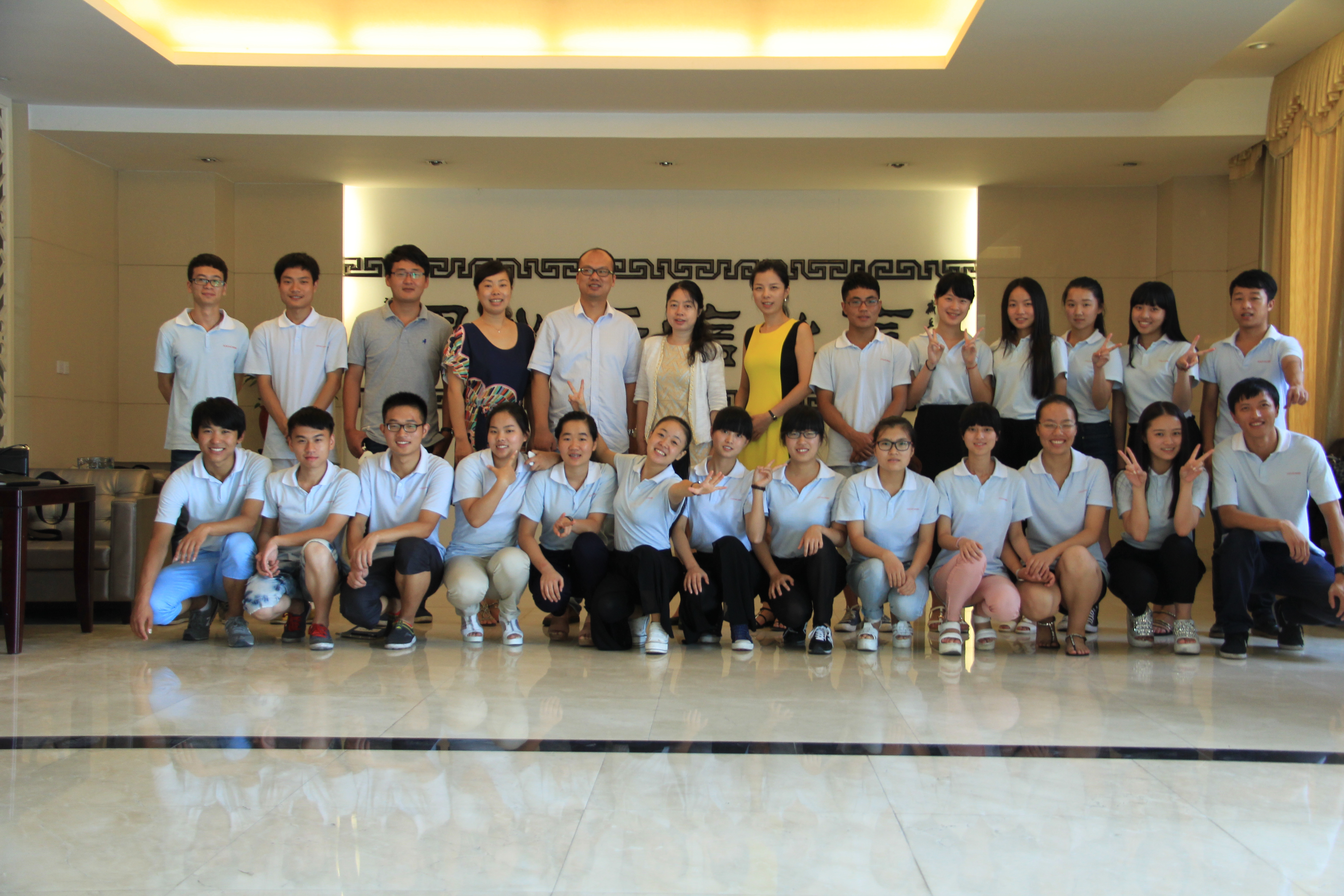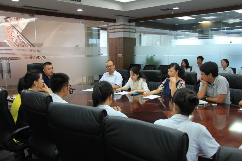 一路我享暑期社会实践队的队员们在行政大楼的六楼会议室,奥康集团董事长王振滔、财神捕鱼