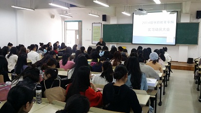 33日下午1:30,财神捕鱼 在南校9号楼C101教室胜利召开14学前专科实习动员大会。出席会议的有财神捕鱼 主管实践教学副院长潘玉进教授、学前系主任曾国老师、教务科胡孙贵老师、各实习带队老师以及19214学前专科实习生。