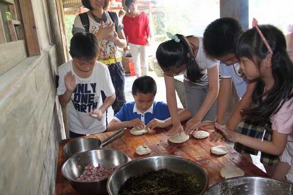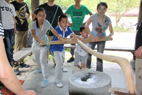 上午9点多,我们到达了目的地后,很快就展开了各种农家体验活动。先是孩子们分2组,分别进行包粽子和磨豆腐,然后交换。接着开始做麦饼和捣年糕。孩子们在当地居民和各自家长的指导下,兴致勃勃、热火朝天地投入活动,体验了平时难得接触的农家工作。