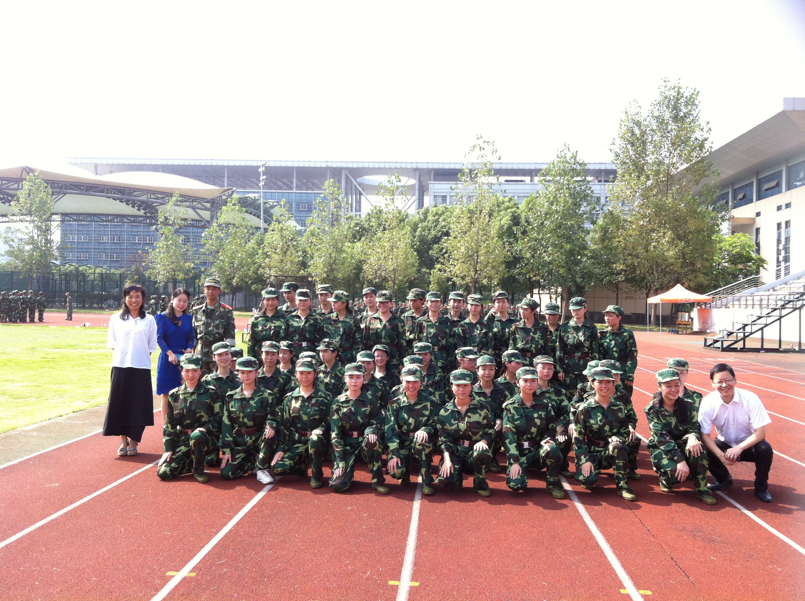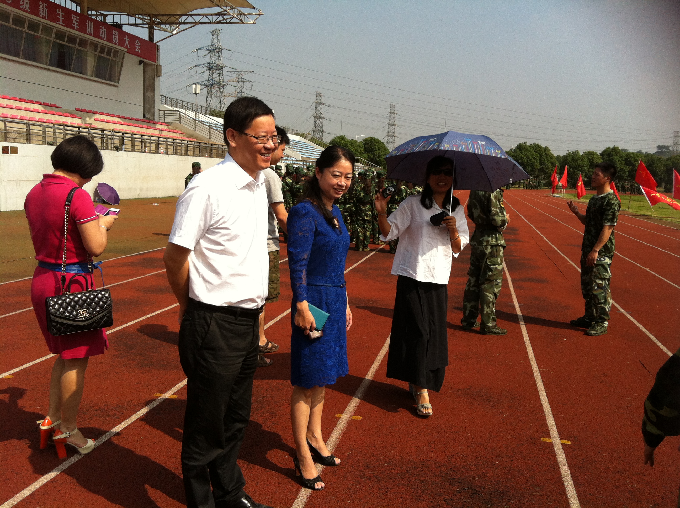 领导郑信军院长、嵇小怡副书记到北校田径场亲切慰问参加军训的13级新生。