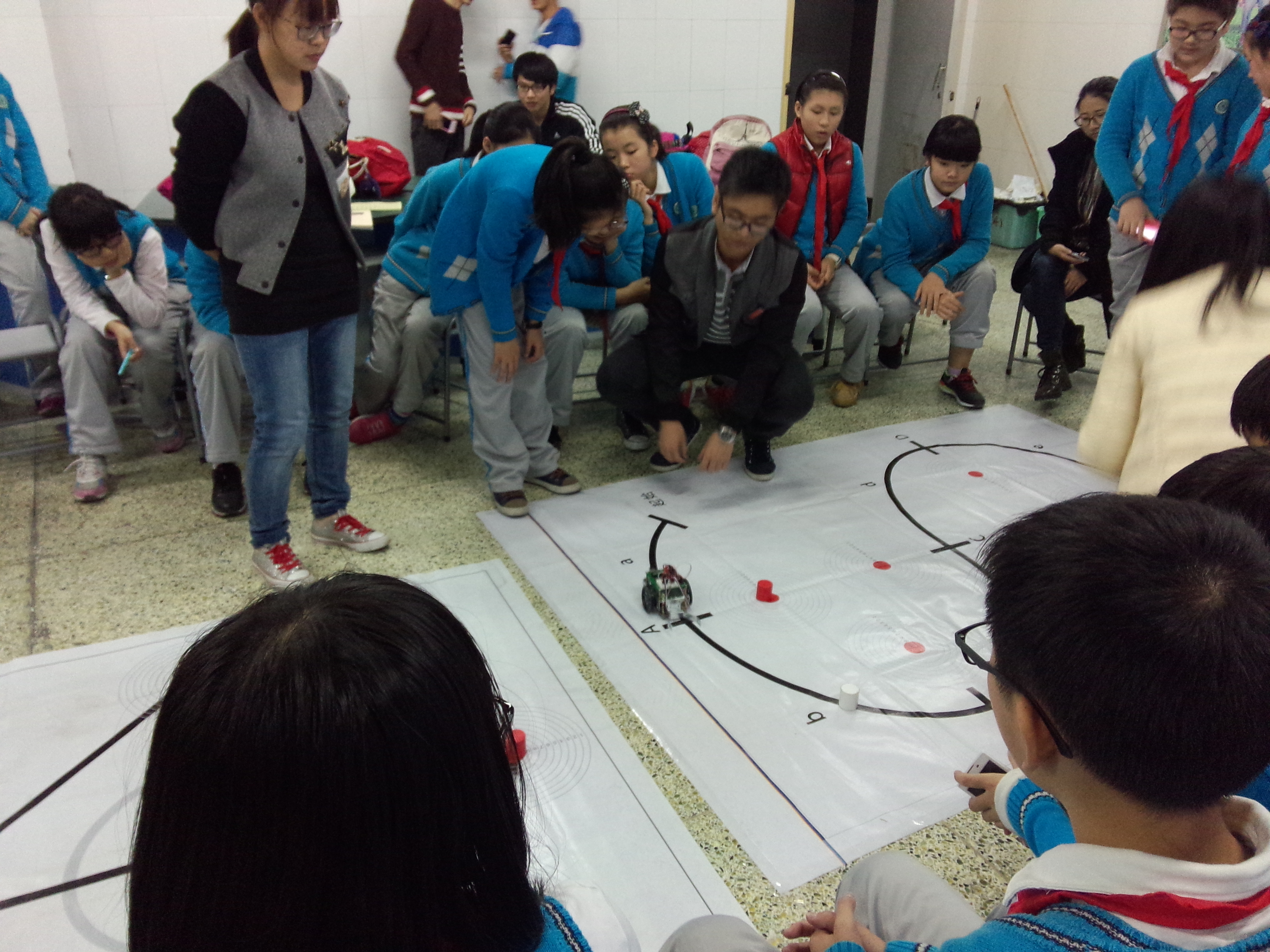 随着理论介绍的结束,由协会成员吴瑞荧、李乐佳、杨帅、胡周炎给大家展示了智能搬运机器人、人型机器人的表演,只见机器人准确的把各种颜色的物块搬运到自己的位置上;人型机器人走路的慢慢悠悠,但却稳稳当当的走到终点。孩子们都异常激动和兴奋,争着抢着要自己动手尝试。