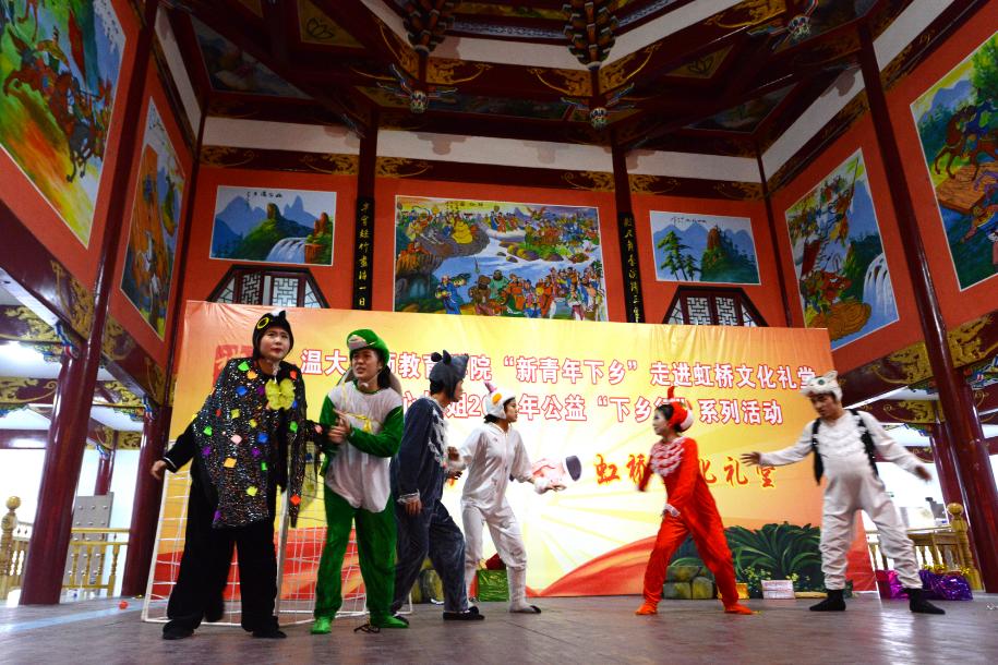 今天下午2时30分,在乐清市虹桥镇前塘村文化礼堂内,财神捕鱼 教师财神捕鱼 “新青年下乡”走进虹桥文化礼堂暨知心姐姐20周年公益“下乡行”系列活动启动仪式顺利举行,乐清市委宣传部副部长徐燕、虹桥镇党委副书记胡永斌、虹桥镇党委宣传委员吕海疆、温州团市委学少部部长池腾飞、乐清团市委 学少部部长 郑亦弟,温大教师财神捕鱼 党总支书记杨立淮、党总支副书记杨丽君出席。启动仪式后,200多名村民正在兴致勃勃的观赏节目,这些节目都是财神捕鱼 教师财神捕鱼 的获奖栏目,表演者都是一群群未来的女教师。这次他们不但为村民带来精彩的节目,在后续的结对活动中还将帮他们彩绘墙壁等,孩子们还能收到喜爱的图书和书法培训,而教授孩子们知识的都是教师财神捕鱼 的师生。