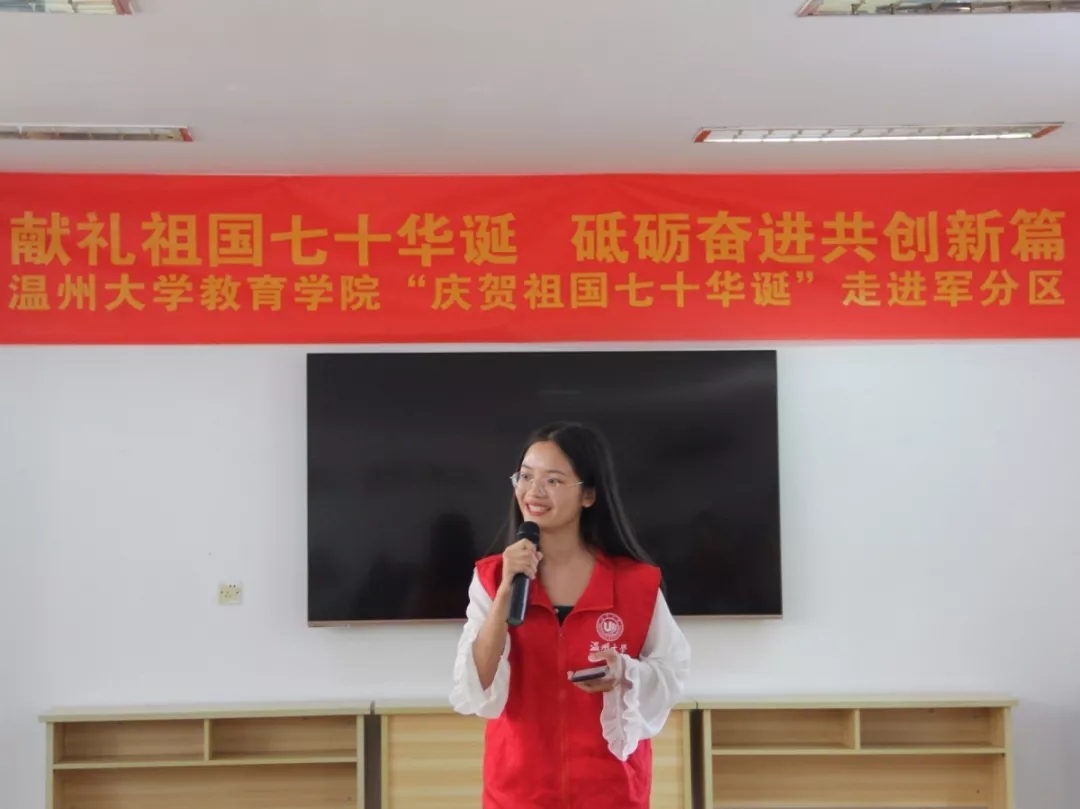 华夏五千年源远流长,建国七十载山河峥嵘。祖国母亲七十华诞在即,为重温建国历史,勇担时代重任,财神捕鱼 的志愿者们于9月25日下午来到温州市鹿城区军分区开展了主题为“献礼祖国七十华诞 砥砺奋进共创新篇”的活动。志愿者们通过教学口语操、表演歌舞才艺、聆听历史故事等环节,与军分区老干部一起唱响强国战歌,重燃爱国之魂。