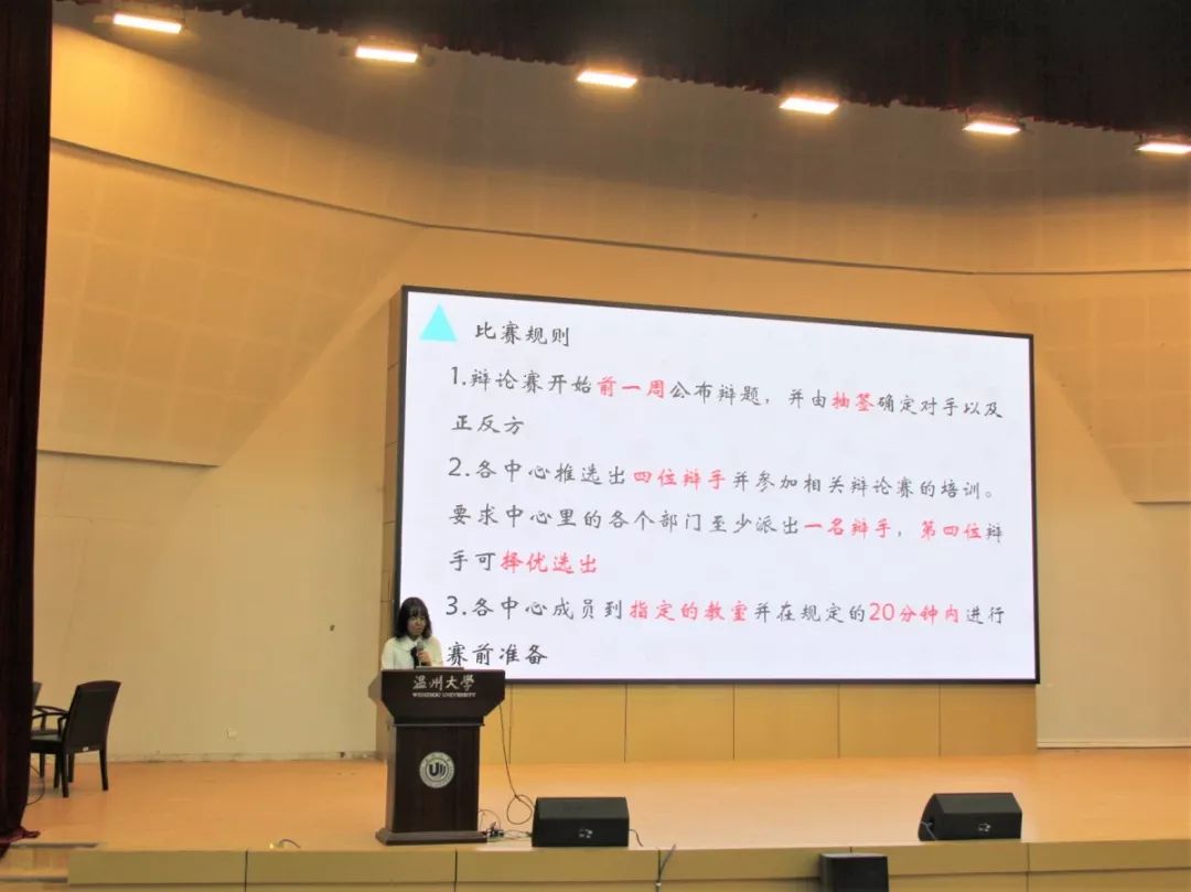 活动伊始,主持人为大家讲解了辩论赛的具体规则。各中心各选出四名辩手作为代表出战辩论赛,并通过抽签决定各方辩题。一辩负责开篇立论,二辩、三辩负责攻辩,四辩负责总结陈词。攻辩环节结束后,开始共八分钟的自由辩论。由主席团成员担任评委,根据评分标准与细则进行打分。
