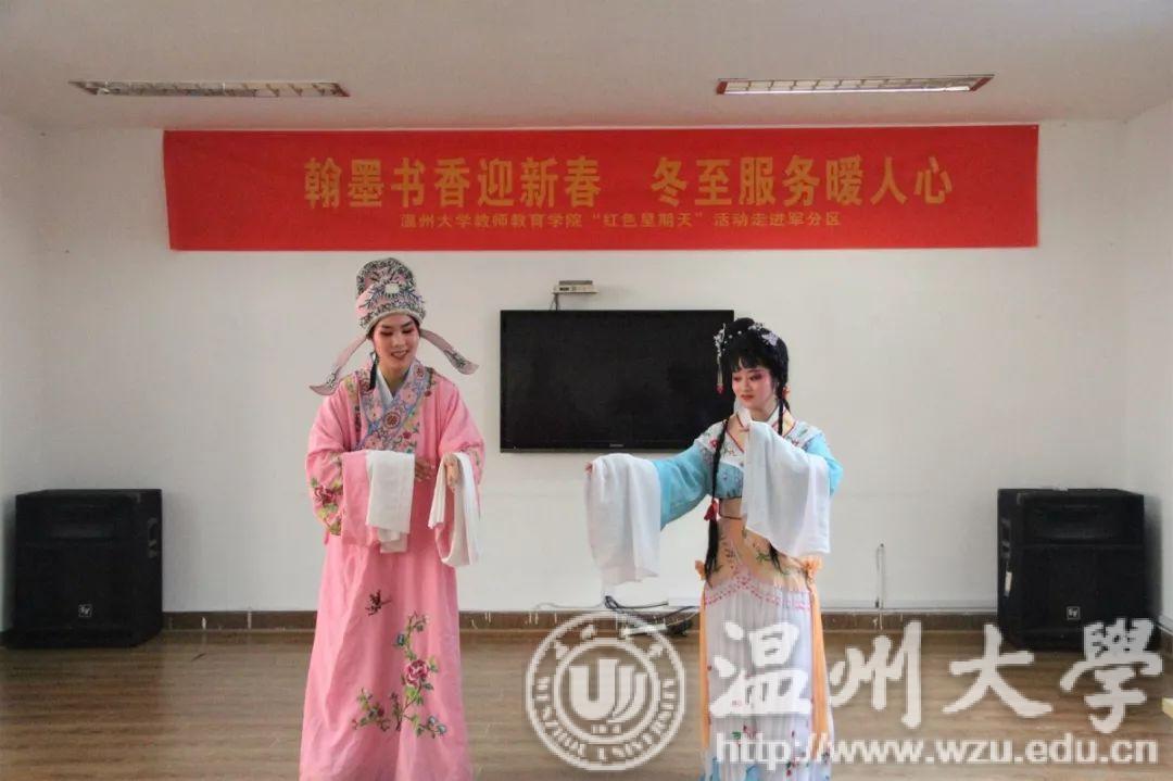 活动伊始,志愿者们提起毛笔,在红色宣纸上写下“民富国强万物盛,人和家兴百业昌”的祝语,将对老人新一年的祝愿同中国传统文化相结合。红纸黑字满是教院学子对老人们的热情关切,老人们的夸奖中也饱含着对青少年的殷切希望,对祖国改革未来的美好期待。“心中想说千句话,万望你梁兄早点来。”志愿者们为老人们带来的是越剧《十八相送》。不少老人跟着音乐,轻叩手指,浅浅吟唱。一曲毕,掌声雷动,优美的唱腔萦绕在耳畔,久久不散。火红灯笼也是传统节日必不可少的点缀。“奶奶,这个地方再剪一刀,然后往里面弯一下……”老人在志愿者的陪伴下,共同参加手工制作灯笼活动。当六个小部件拼成完整的灯笼时,不论是志愿者还是老人,脸上都洋溢着幸福的笑容。在冬至节气中,来到军分区。捧一碗热热的糯米汤圆,执笔写下新春祝福,低吟一曲熟悉的《十八相送》,亲制一盏红红纸灯,将冬至之传统与红色革命相结合,为曾经意气风发的老人们共奏一曲岁月的赞歌,让敬老爱老服务社会的火热驱散冬日的严寒。