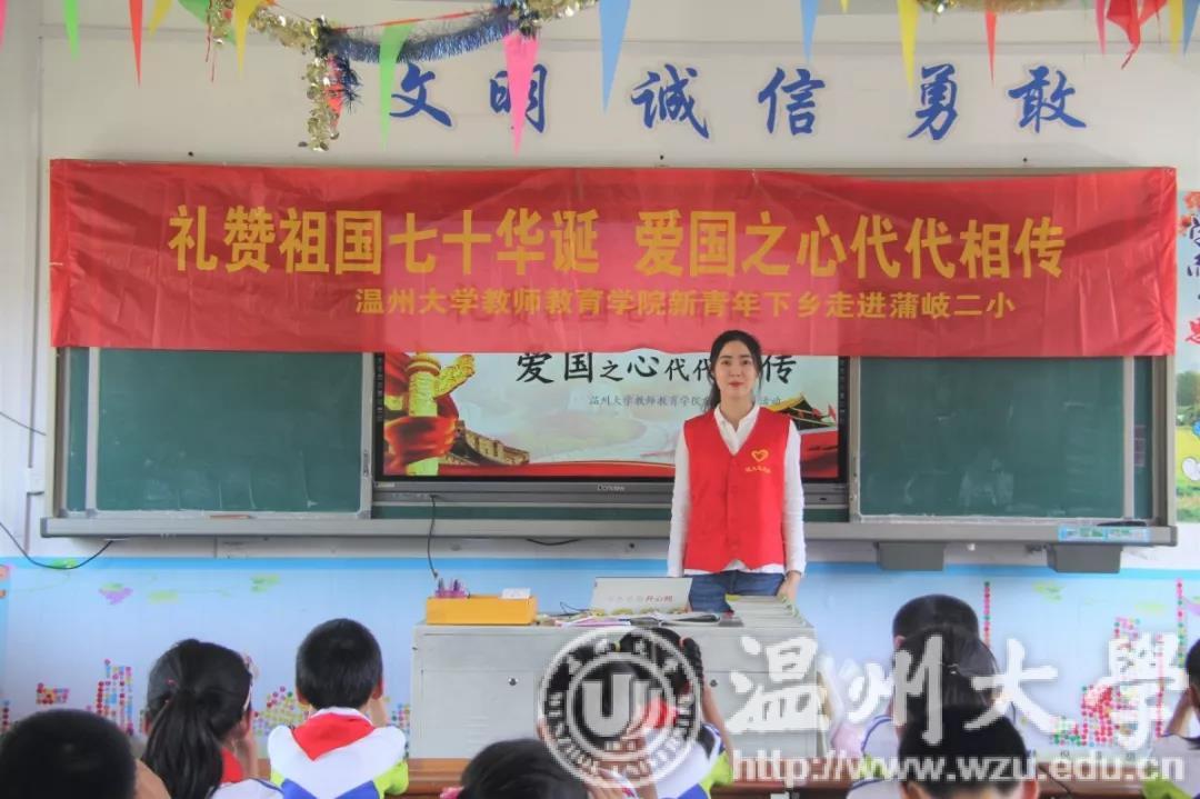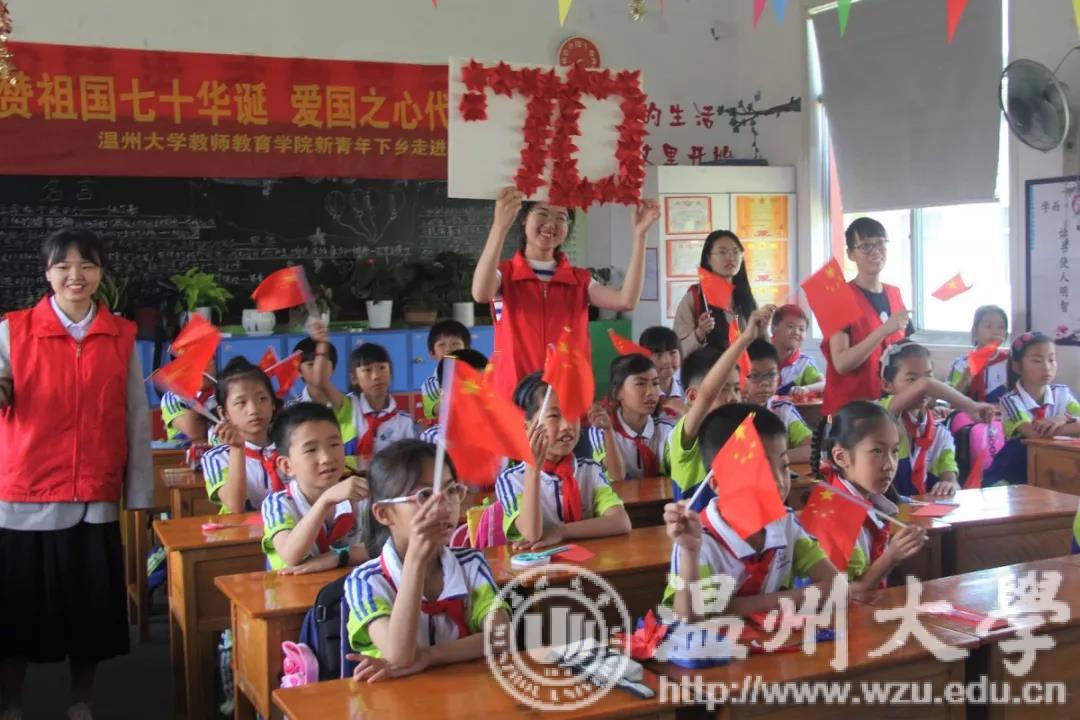 致敬新时代,中华人民共和国成立七十周年。5月29日下午,财神捕鱼 教师财神捕鱼 的志愿者们前往乐清市蒲岐二小开展了以"礼赞中华人民共和国成立七十周年,爱国之心代代相传"为主题的新青年下乡活动。志愿者们通过故事宣讲、手工制作、歌曲教授,将爱国情怀传递给孩子们,激发他们的爱国之心和报国之心。