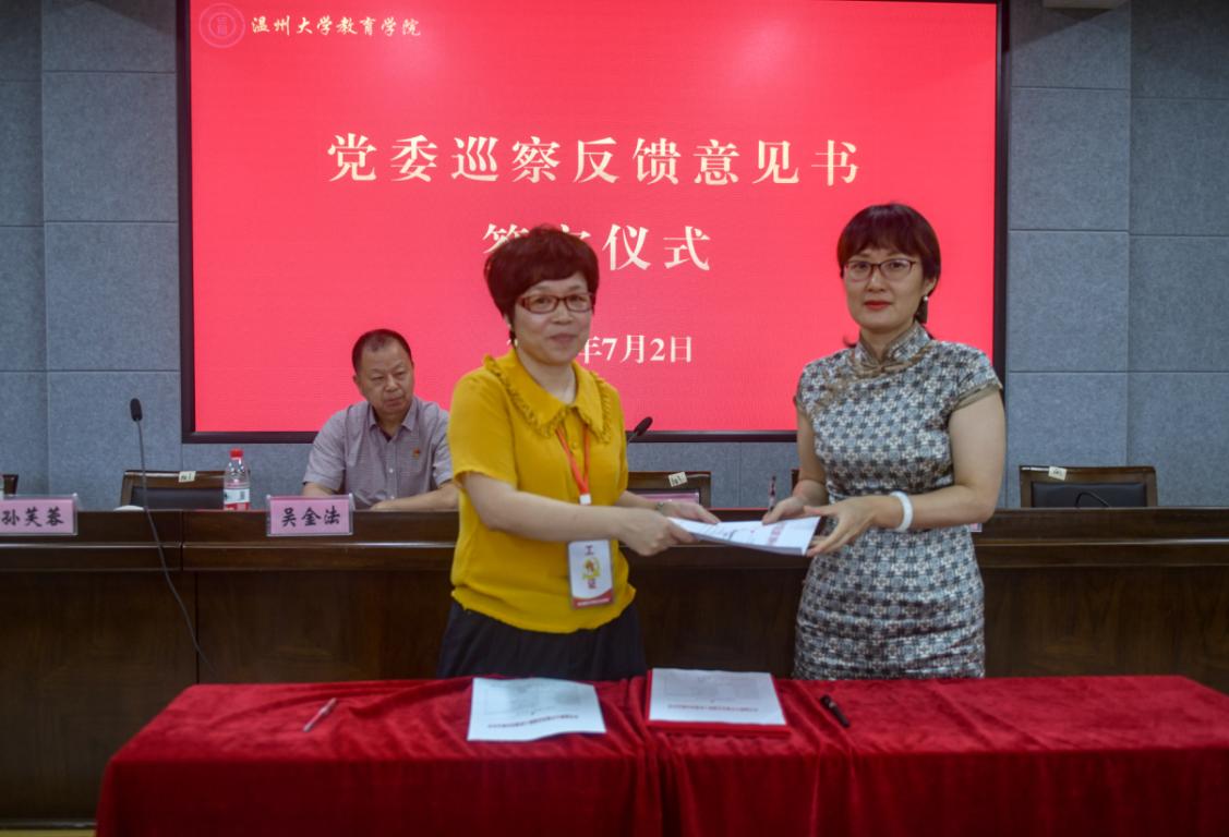 会上,党委巡察一组组长王艳与财神捕鱼 院长、党委副书记孙芙蓉在巡察情况反馈意见书上进行了签字背书。
