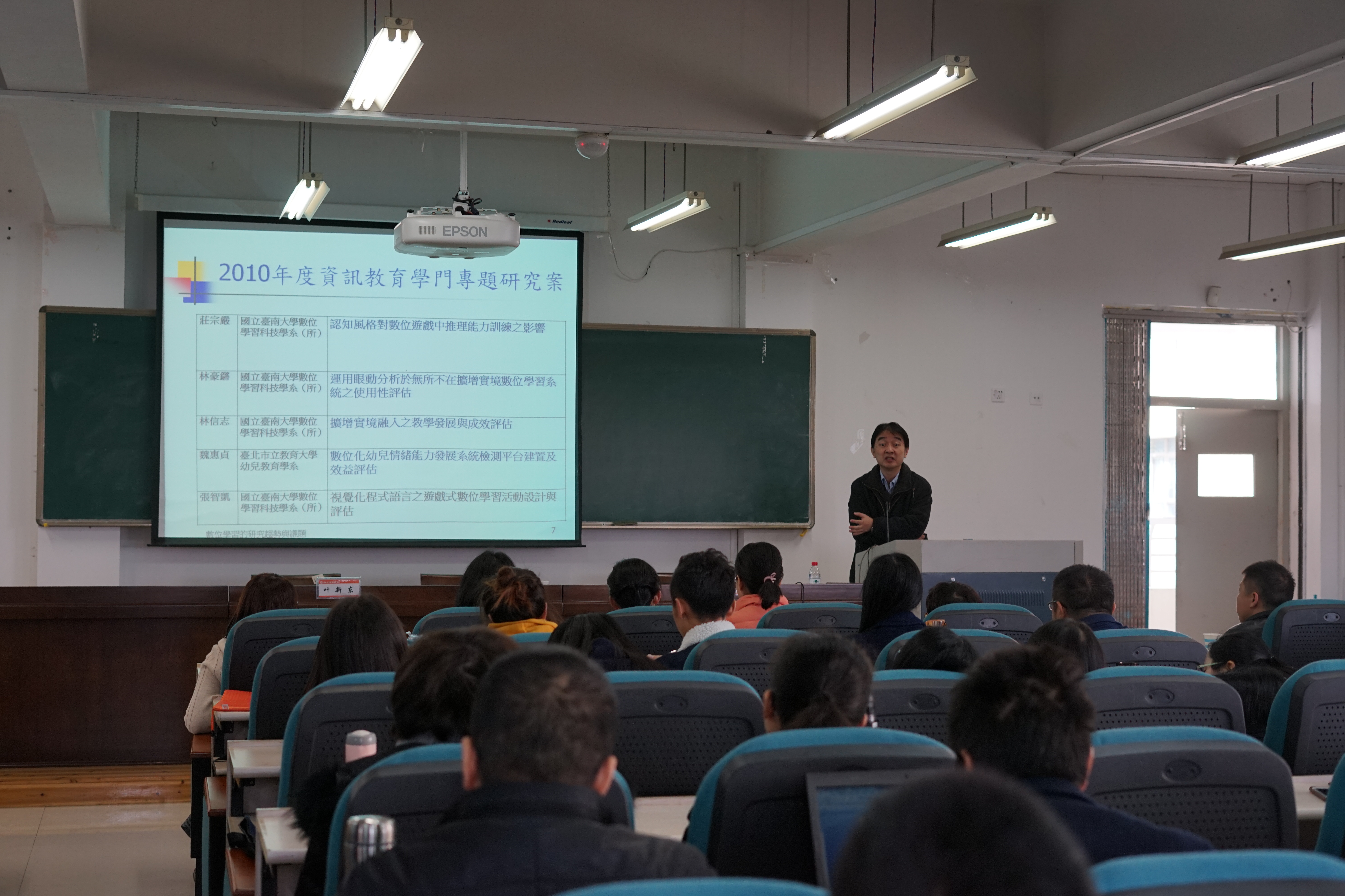 致欢迎辞后,讲座正式开始。本次讲座黄教授以数位学习的英文教研论文撰写为例,用幽默有趣的语言,深入浅出地讲授了论文写作前的准备工作、论文写作中框架各部分的具体内容构思以及论文完成后的投稿工作。具体内容包括“如何做到数位学习研究的学术创新”、“开始写作前的准备功夫”、“最容易写不好的论文部分:研究背景与动机、文献回顾”、“讨论与结论”与“期刊论文投稿与修改经验”。黄教授以务实的讲授风格向师生们说明论文撰写需要具体应该做些什么,而且从方法论的角度说明了具体应该怎样做。这种务实求真的学术态度、严谨考究的学术思维以及专业规范的学术表达等赢得了师生们的阵阵掌声。意犹未尽时本次讲座已经接近尾声,主持人叶新东院长再次表达了对黄教授学术态度等的尊敬并感谢黄教授为师生们带来了一场务实精彩的学术论文指导讲座。
