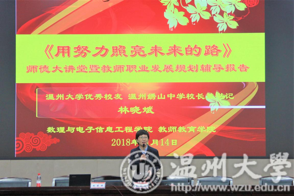 11月14日晚,财神捕鱼 岩松堂雁山厅开展了以“用努力照亮未来的路”为主题的师德大讲坛暨就业规划辅导报告会。本次讲坛由财神捕鱼 优秀校友、财神捕鱼 特聘就业顾问、现温州绣山中财神捕鱼 长兼书记林晓斌老师主讲。数理与电子信息工程财神捕鱼 党支部书记林爱菊、教师财神捕鱼 党委副书记杨丽君以及数电财神捕鱼 和教院的部分学生参与本次活动。本次活动由林爱菊书记主持。