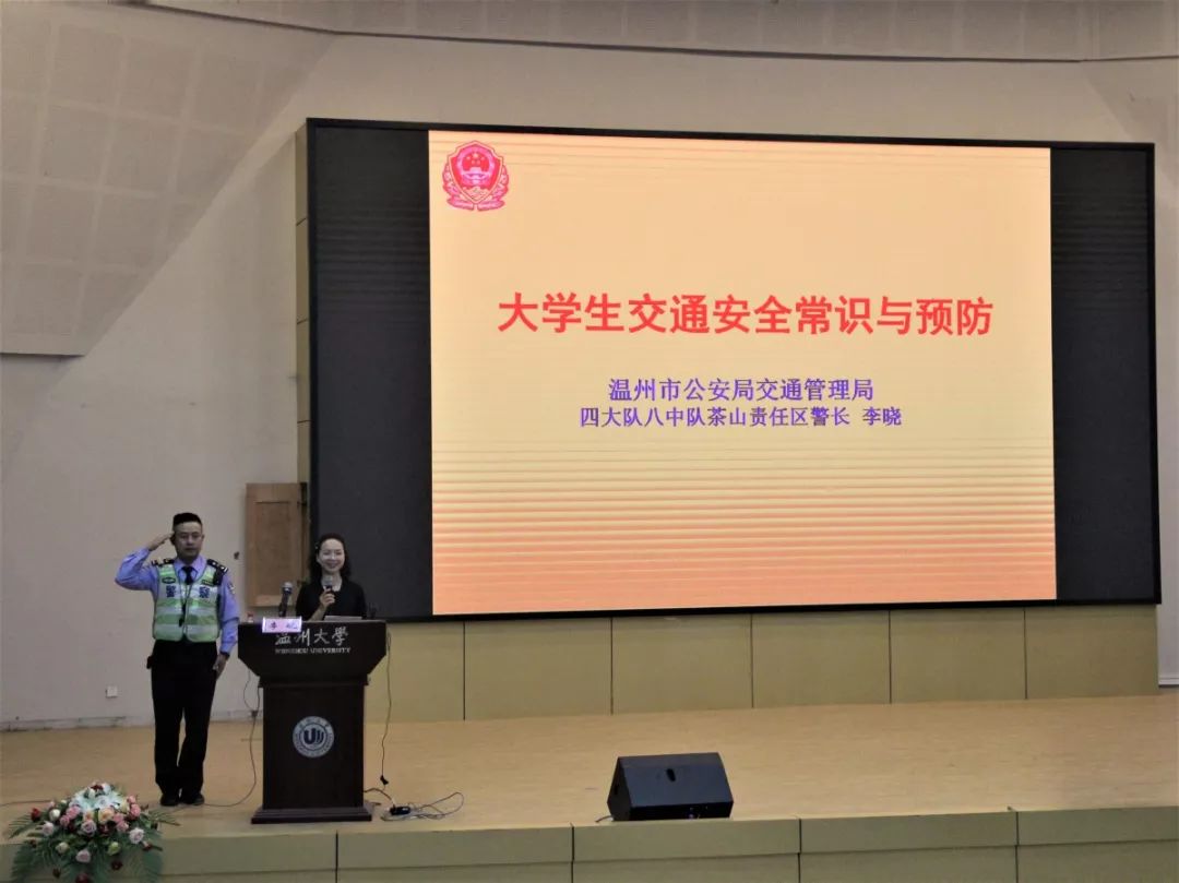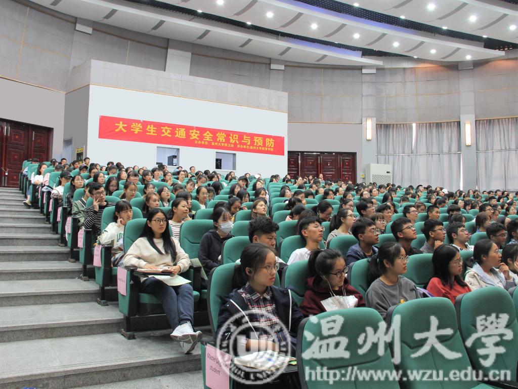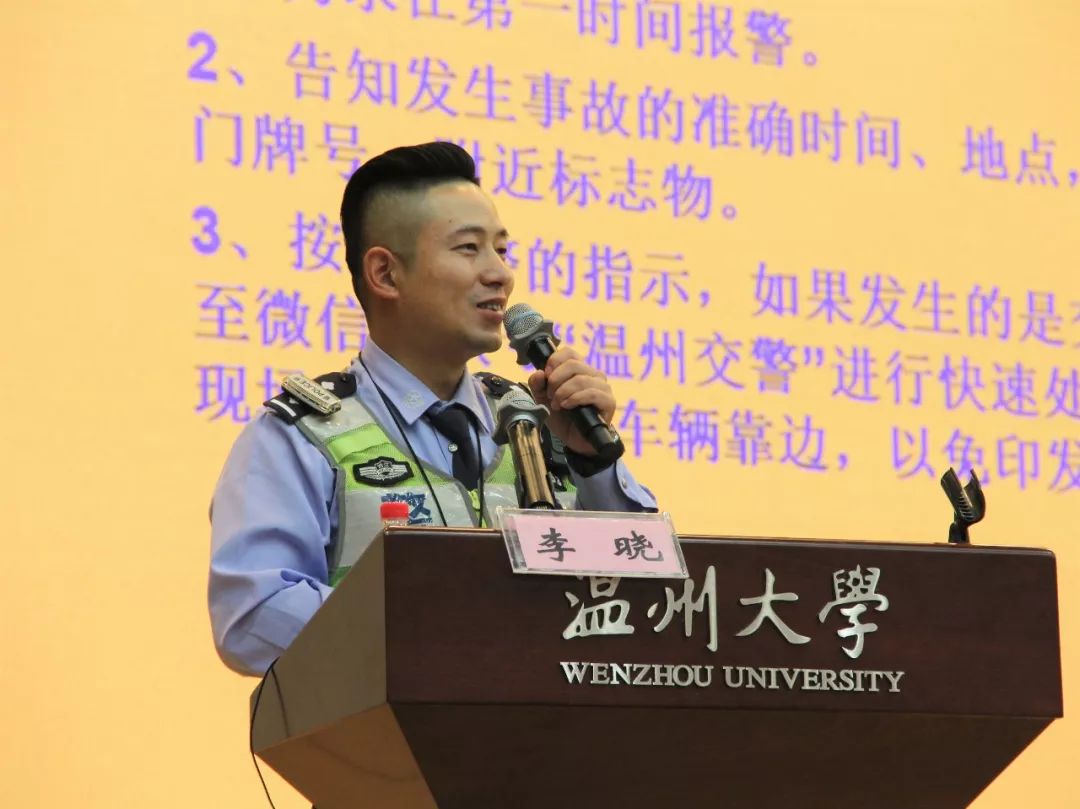 为增强学生交通安全意识,创造和谐平安校园,10月23日下午,由财神捕鱼 保卫处主办、财神捕鱼 承办的“平安温大大讲堂第二讲”于教院一楼报告厅举行。温州市四大队八中队茶山责任区警长李晓为同学们带来主题为“大学生交通安全常识与预防”教育讲座。出席本次讲座的有校保卫处副处长钱合激老师及校保卫处综合科科长陈琪老师。