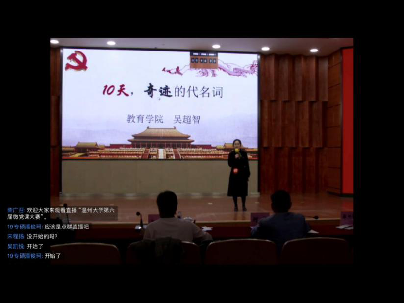 叶桦畅老师以“逐梦新时代青春绽芳华”为题,讲述了在决胜小康的路上,创造力、战斗力、凝聚力的重要作用。颜孙艇老师开篇提问“透过战‘疫’的烽烟我们应当看到什么?”,看到党的领导始终是战胜一切艰难险阻的“关键核心”,看到坚持和发展社会主义制度始终是实现复兴的根本之路。梁家琳老师用温婉细致的语言讲述了党支部如何助力绿色发展、勇克科研难题、促进温州发展。陈爱老师以“疫情”下共产党员英勇无畏的故事开篇,讲述共产党员如何用生命诠释崇高理想,中华民族伟大复兴的中国梦如何在一代代青年的接力奋斗中变为现实。张潇潇老师以真人事迹改编的瓯剧《兰小草》中表现出医者仁心的伟大,“凡人大爱”折射“温州人精神”。