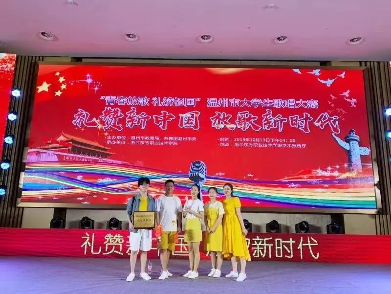 青春为祖国歌唱,奋斗为梦想加油。新中国成立70 周年之际,由温州市教育局,共青团温州市委主办,浙江东方职业技术财神捕鱼 承办的“青春放歌,礼赞祖国”温州市大学生歌唱比赛如期举行。财神捕鱼 学子周斌杰、卢家俊、陈雨晨、陈诺、张瑾以一首《青春花开美乡村》夺得一等奖中的第一名。