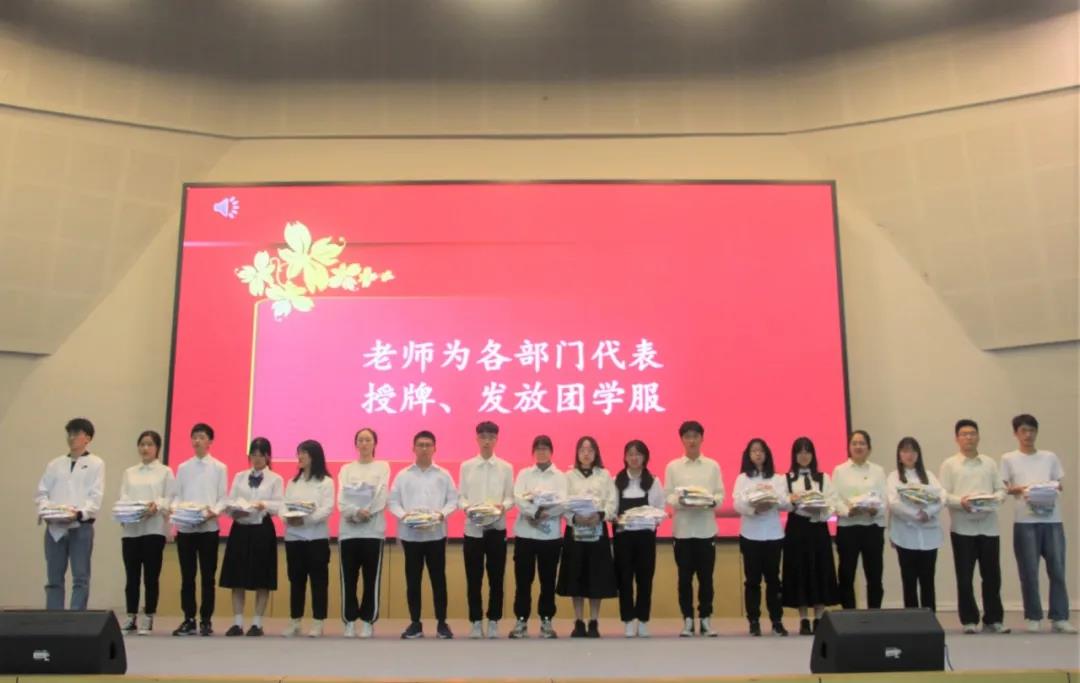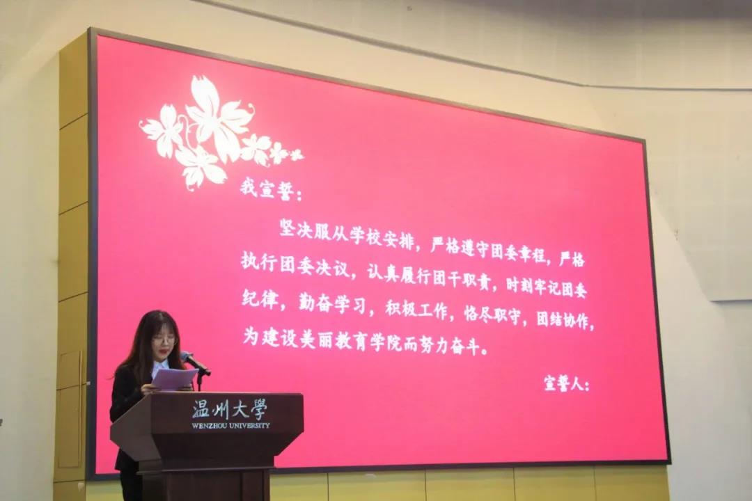 团歌奏响,谢红详细介绍了本次团员骨干培训及团校培训管理办法。紧接着组织部负责人葛亿佳对团校学员考核评优制度以及学员手册做出了详细解读,并带领全体成员宣誓,誓词庄严,团学精神将印刻于所有宣誓人心中。宣誓结束后,主席团成员为各部门代表分发象征“博爱雅艺”师范气质的团服与工作牌,这不仅让团员骨干有了归属感,也传递了教院的一份信任。期待他们能够不负众望,在接下来的工作与学习生活中磨砺出更优秀的自己。