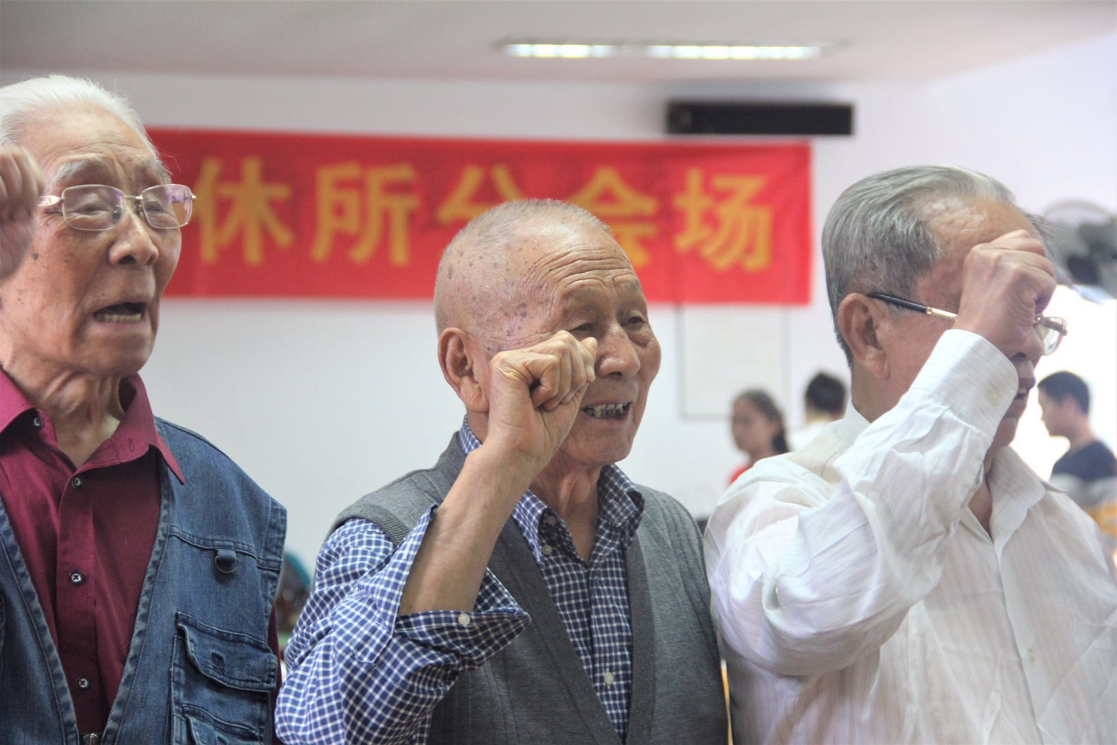 作为一个党员,最难忘的想必就是入党宣誓的时刻了,在这一次的演出中特别加入了重温入党誓词的话环节,各位退休老干部们原本含笑的双眼顿时闪现了异样的神采和光芒,主动的围了上前站在鲜艳的党旗面前,举起握拳的右手放在了耳际,跟着领读者一字一句,高举的右手隐隐的有些颤抖,但诵读的语气却无比的坚定,还有那眼中映出的党旗如炬如焰,这就是党的不熄之火吧。