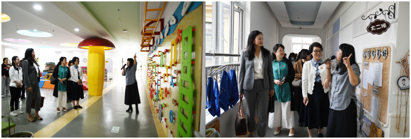 第二个环节,园所参观。文成县实验幼儿园园长吴淑芹带领专家团队参观园所环境,向大家介绍了园所的基本情况,课程理念以及环境创设。专家团队给与了充分认可,并提出了一些建设性意见。