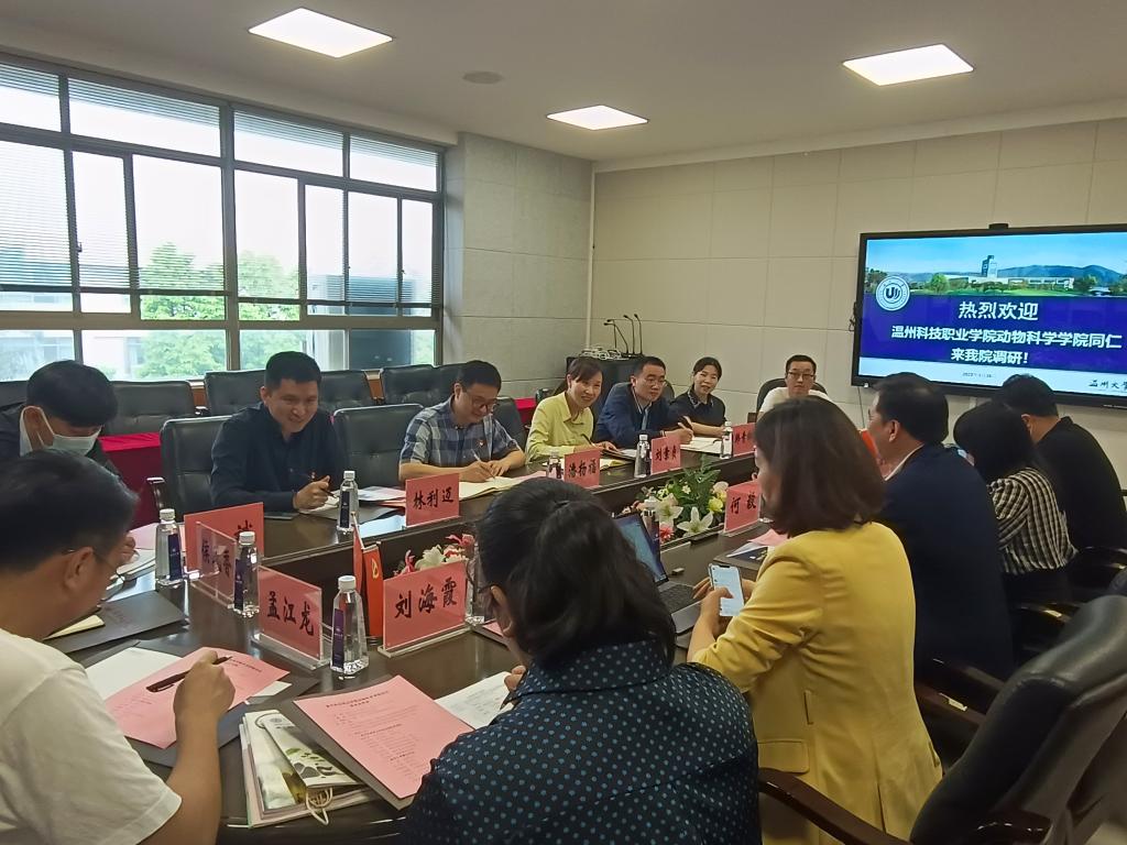 5月26日上午,温州科技职业财神捕鱼 动物科学财神捕鱼 潘杨福院长、刘素贞执行院长一行8人来财神捕鱼 调研全国党建标杆院系创建情况。财神捕鱼 党委书记何毅、副书记彭小媚、副书记章园园、小教系书记刘海霞、党建办工作人员等参加了调研交流会。