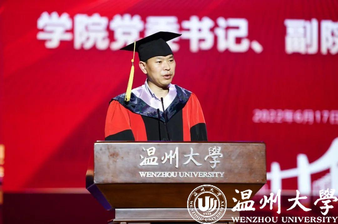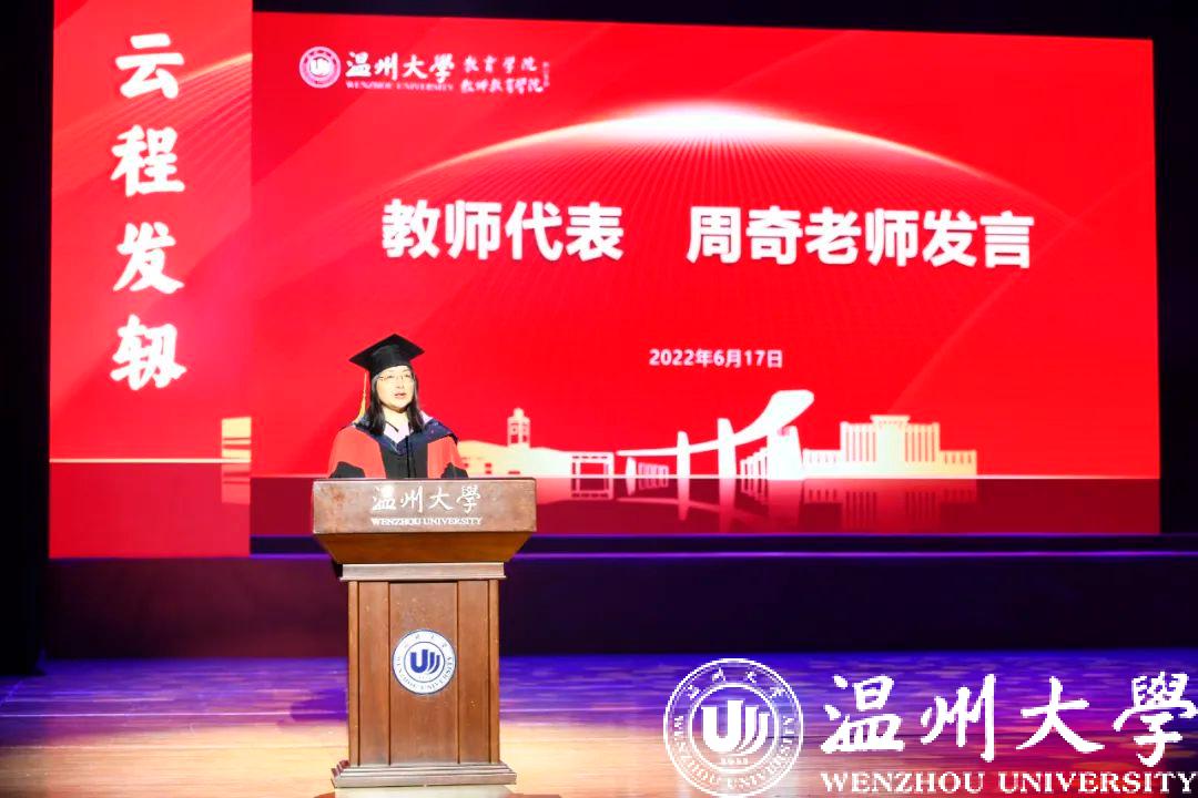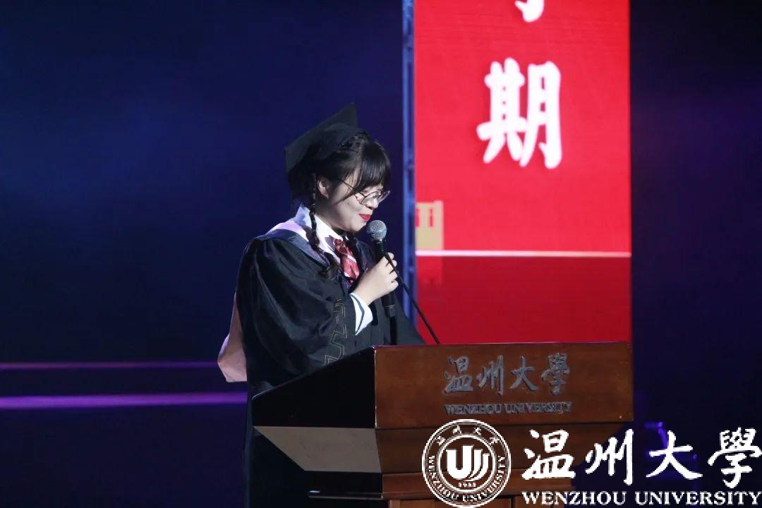 2022届应用心理学专业学子陆以恒作为毕业生代表发言。她由衷地向母校表达了感恩与怀念之情,表示在今后的人生道路中,将会带着母校的期盼,始终秉承“求学问是,敢为人先”的校训,带着赤子之心砥砺前行,时刻以做一名具有“博”“爱”“雅”“艺”师范气质的教院人来要求自己,让青春在不懈奋斗中绽放绚丽之花。最后,她希望同学们能够乘长风破万浪,不负青春不负韶华!