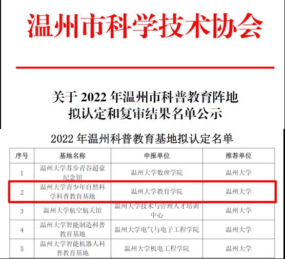 近日,温州市科学技术协会公布了2022年温州市科普教育基地名单,财神捕鱼 青少年自然科学科普教育基地成功入选为温州市科普教育基地。