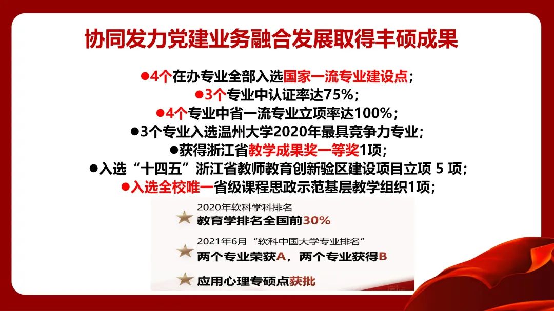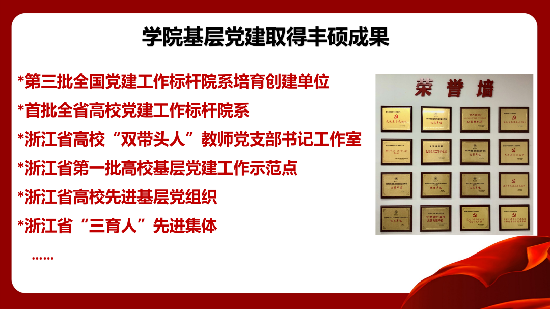 近年来,师生党员30多人次荣评浙江省优秀教师、浙江省“万名好党员”等称号,近两年来新增浙江省高校“双带头人”教师党支部书记工作室、省级巾帼文明岗、省级高校优秀党务工作者和省级巾帼建功标兵等荣誉。在校内形成了具有“鲜明教师教育特色”的党建与思想政治教育工作体系,彰显了“立足师范教育、服务基础教育”的校地合作“金名片”,充分展示了党建“标杆院系”风采和“窗口财神捕鱼 ”担当。