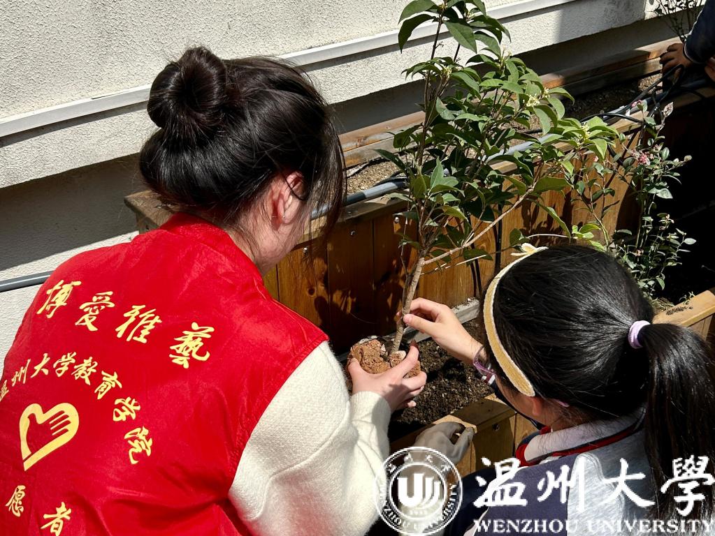 “这是桂花树苗!因为它有小黄花!”“如果我们仔细照顾蓝莓苗,等它长大了,我们岂不是可以收获很多甜甜的蓝莓!”伴随着此起彼伏的童声,小朋友们在“花果山庄”的肆意阳光下,望着志愿者们手中的桂苗与蓝莓树苗,热情高涨,跃跃欲试。