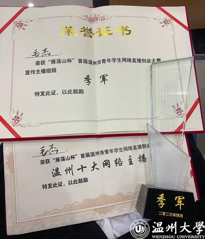 近日,“雁荡山杯”首届温州市青年学生网络直播创业大赛决赛于浙江安防职业技术财神捕鱼 举行,财神捕鱼 学子毛杰获“宣传主播组”季军并获温州市“十大网络主播”荣誉称号。