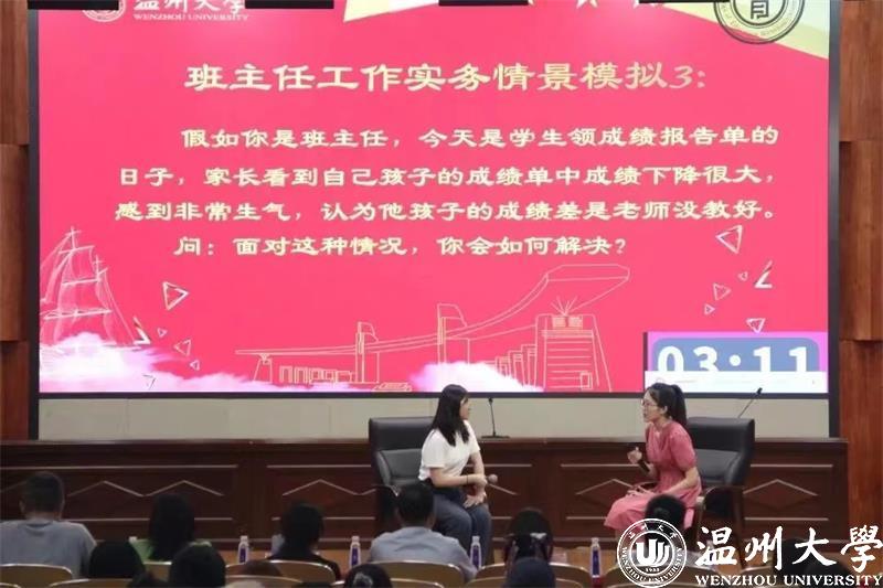 在即席演讲的头脑风暴中,选手们将精巧的思想汇聚成言语,在舞台上各抒己见,其中有对教育议题的探讨,有对耳熟能详的理论的剖析,更有别出心裁的观点……而在班主任实务模拟情景中,两类场景“师生交流”和“家校交流”则给同学们们极大的考验。一些选手面对班级学生的“刁难”,因材施教、循循善诱,充分展现出班级管理的智慧;一些选手面对焦急的家长,沉着冷静,有条不紊,用清晰的思路和流畅的语言设身处地与家长进行沟通,表现了自己作为班主任的带班理论和应急应变等各项技力。