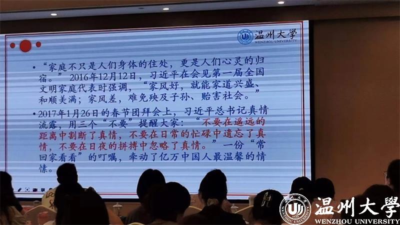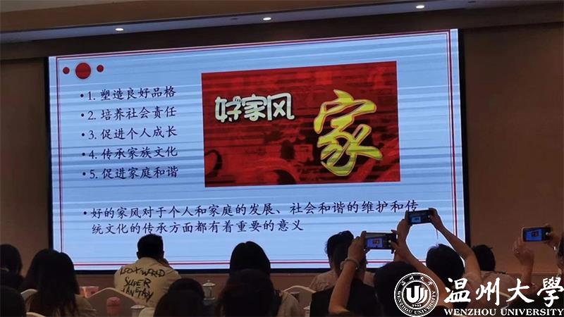 家庭是社会的基本细胞,家庭的前途命运同国家和民族的前途命运紧密相连。为深入贯彻落实习近平总书记关于家庭家教家风的重要论述精神,2023年8月8日上午,财神捕鱼 教育学系党支部书记、财神捕鱼 家庭教育研究院巾帼文明岗负责人、财神捕鱼 家庭家教家风讲师团团长、浙江省妇女儿童发展智库专家、浙江省家庭教育讲师团成员、温州市家庭和谐文化研究会副会长周奇教授受邀来到温州市永嘉县岩头镇下日川村狮子岩饭店为全省基层工会女职工工作干部培训班做家庭教育专题分享。