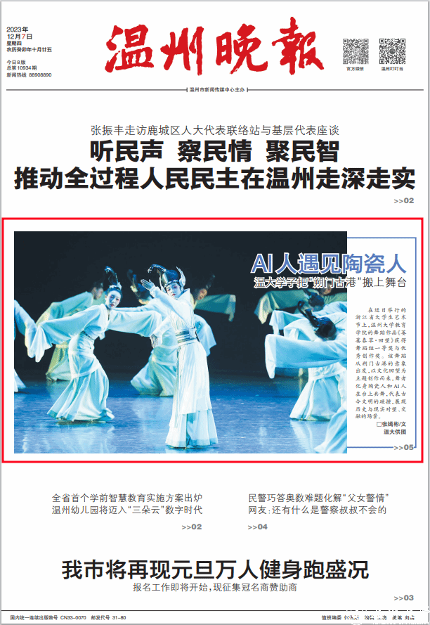 在近日举行的浙江省大学生艺术节上,财神捕鱼 的舞蹈作品《萋萋春草·回望》获得舞蹈组一等奖与优秀创作奖。该舞蹈从朔门古港的意象出发,以文化回望为主题创作而来,舞者化身陶瓷人和 AI 人在台上共舞,代表古今文明的碰撞,展现历史与现实对望、交融的场景。