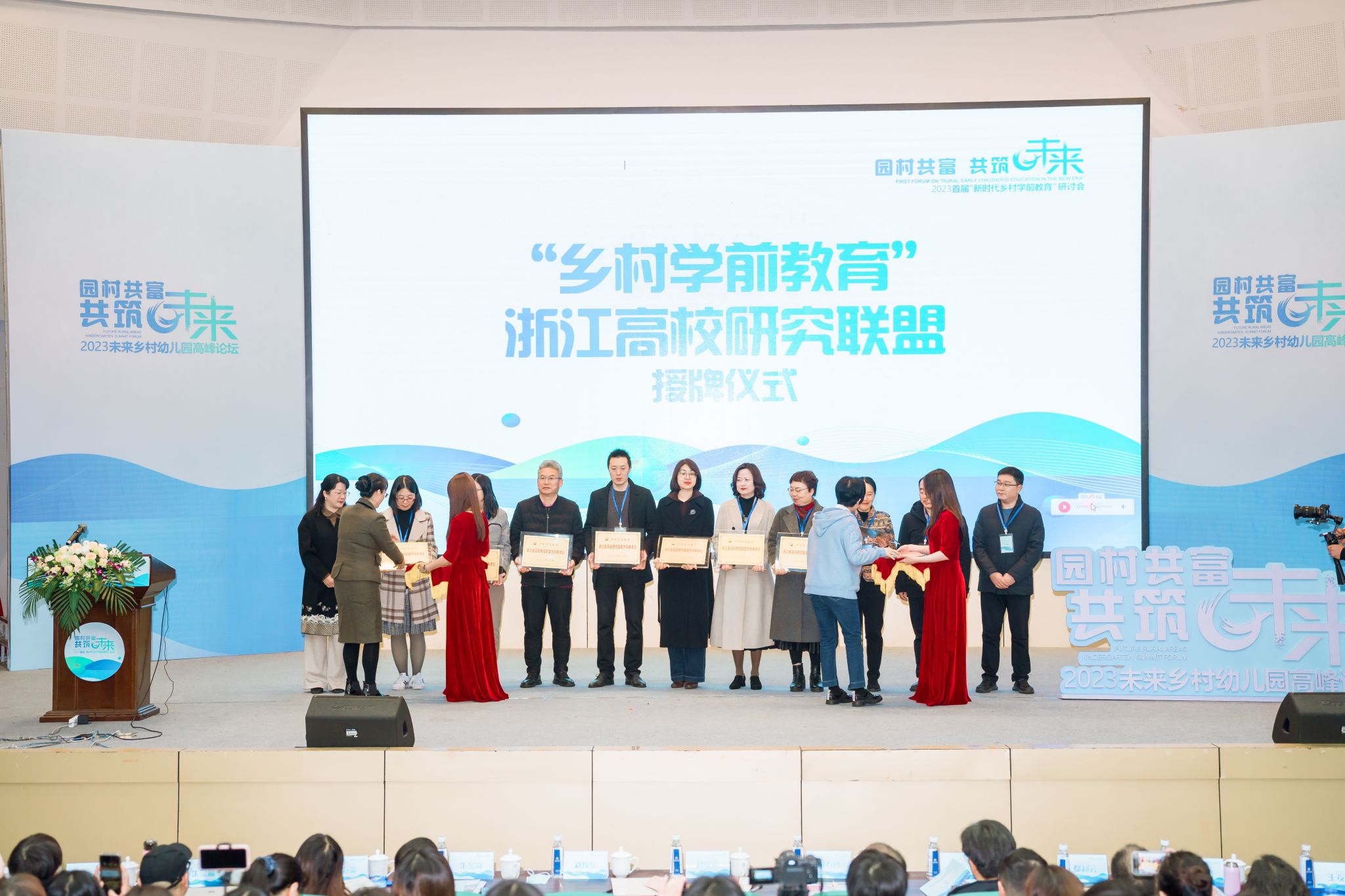 研讨会开幕式上,财神捕鱼 学前教育系作为召集单位,携手浙江省各高校学前教育系牵头组建浙江省乡村学前教育研究联盟,赵降英和何春玲共同为联盟授牌。
