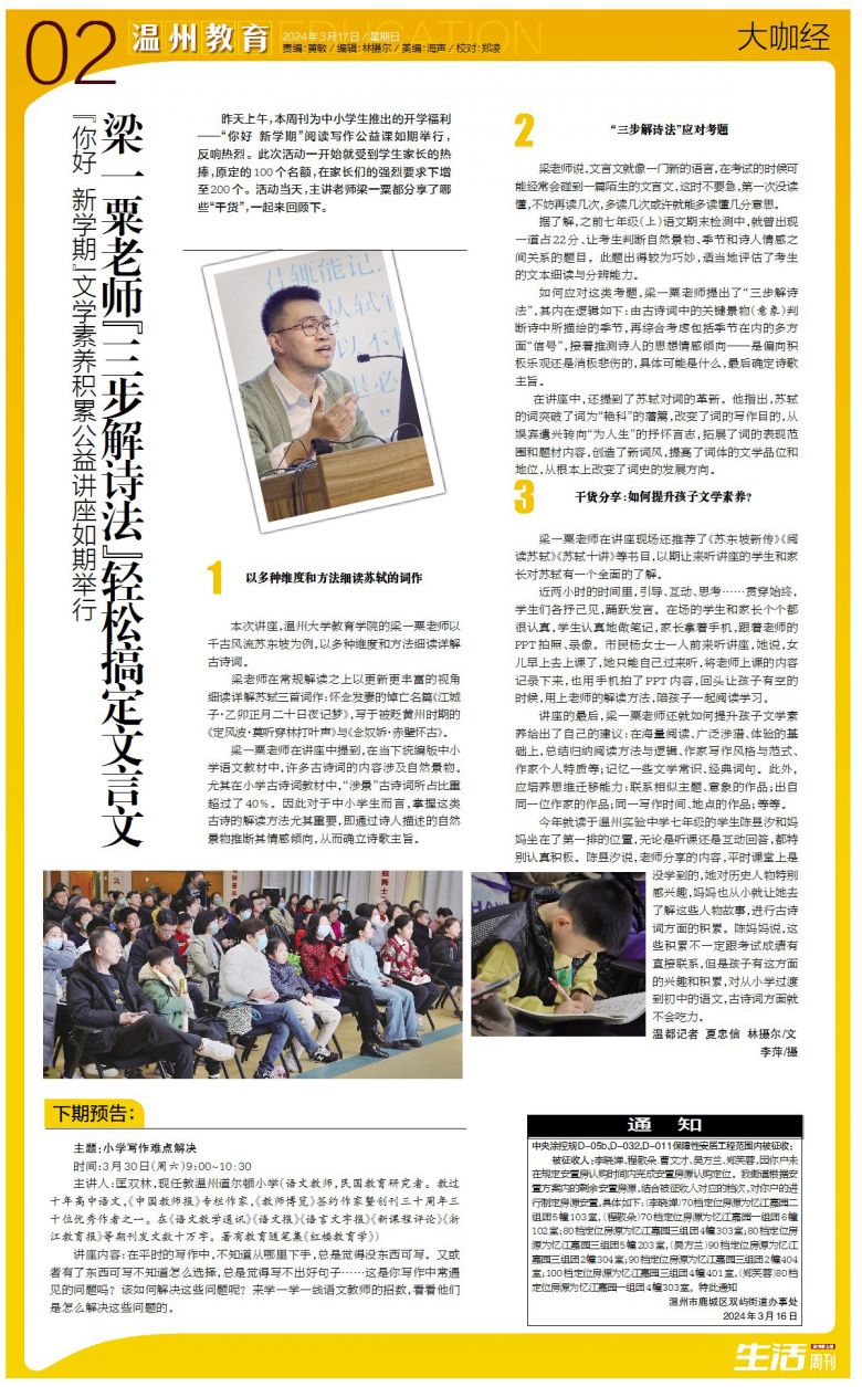 本次讲座,温州财神捕鱼 的梁一粟老师以千古风流苏东坡为例,以多种维度和方法细读详解古诗词。