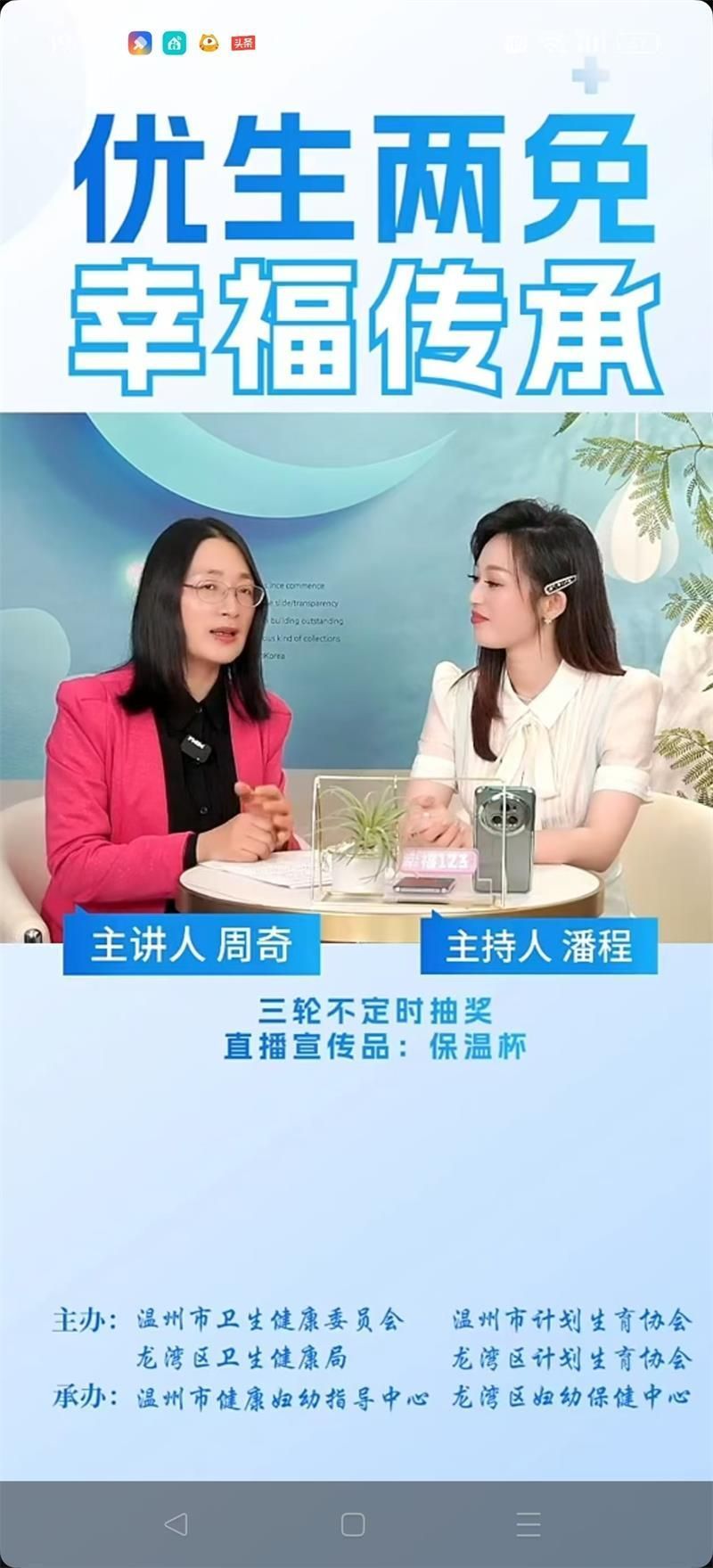 520与小满相遇,万物始茂,盈而未满。爱情和幸福如同成熟的果实,甜美而圆满。今年的520以“优生两免,幸福传承”为主题,龙湾区妇幼保健中心联合温州市卫健委、市计生协、市健康妇幼指导中心,龙湾区卫健局、区计生协等多部门,在“健康温州”和“市健康妇幼指导中心”“幸福123”直播间开展“优生两免,幸福传承——龙湾区新型婚育文化宣传”访谈直播,财神捕鱼 教育学系党支部书记、财神捕鱼 家庭教育研究院院长、温州市家庭教育学会副会长、温州市家庭和谐文化研究会副会长周奇教授受邀在线畅聊婚恋观、生育观、家庭观,传授新人们夫妻经营秘诀,将甜蜜藏于心间。