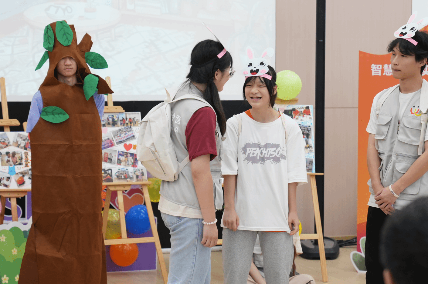 “宝贝,我们马上就要开始新的生活了!”“哇爸爸,这里的大树比我们以前住的地方还要高呢!”随后,由孩子们和大学生志愿者们一起演绎的心理情景剧《小兔子的新朋友》拉开序幕。