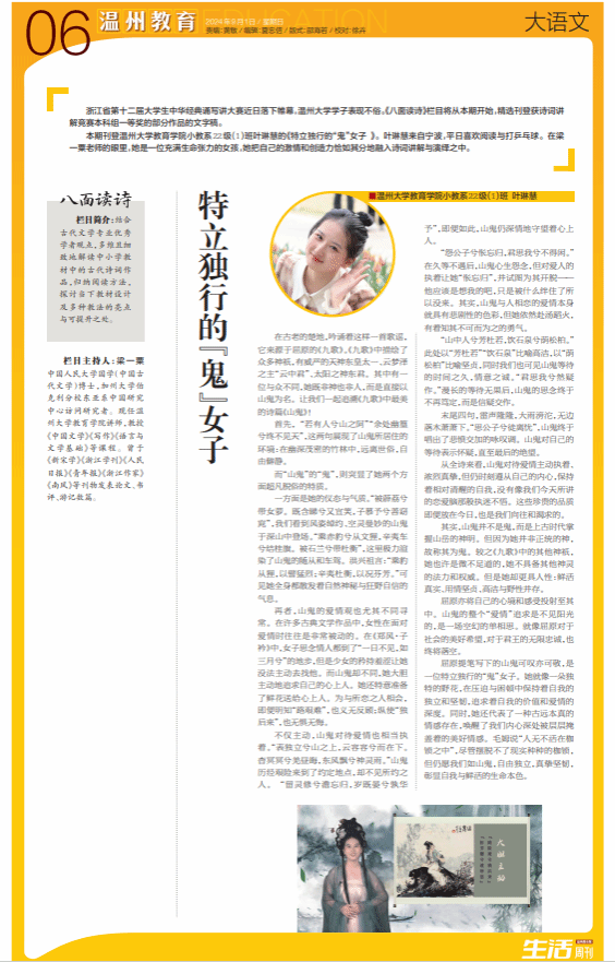 浙江省第十二届大学生中华经典诵写讲大赛近日落下帷幕,财神捕鱼 学子表现不俗。《八面读诗》栏目将从本期开始,精选刊登获诗词讲解竞赛本科组一等奖的部分作品的文字稿。 本期刊登财神捕鱼 小教系22级(1)班叶琳慧的《特立独行的“鬼”女子 》。叶琳慧来自宁波,平日喜欢阅读与打乒乓球。在梁一粟老师的眼里,她是一位充满生命张力的女孩,她把自己的激情和创造力恰如其分地融入诗词讲解与演绎之中。