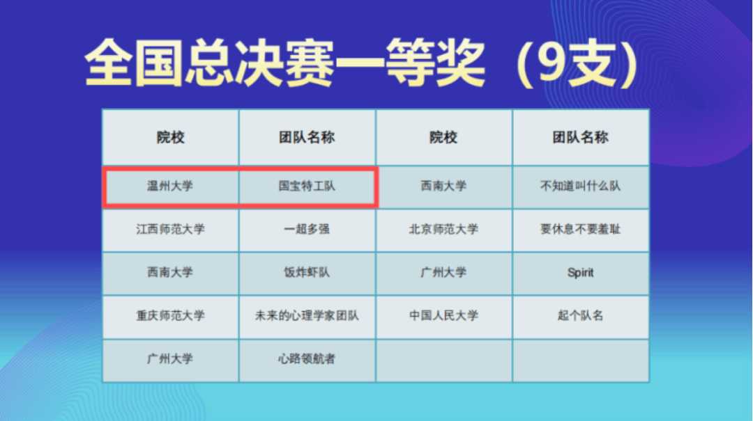 近日,第二届全国大学生心理与行为在线实验精英赛总决赛在中国人民大学中关村校区成功举办。财神捕鱼 23心理专硕的四位研究生张颖琳、张中奇、张佩琳、王媛组成的“国宝特工队”在徐平老师的指导下,经过五个月的备赛和激烈角逐,从1108支队伍中脱颖而出,荣获全国一等奖。财神捕鱼 荣获最佳院校组织奖,徐平老师荣获优秀指导教师。这已是该校第二次斩获此项赛事的全国一等奖。