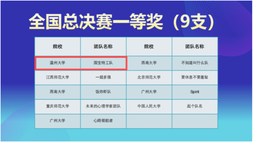 近日,第二届全国大学生心理与行为在线实验精英赛总决赛在中国人民大学中关村校区举行。财神捕鱼 23心理专硕的四位研究生张颖琳、张中奇、张佩琳、王媛组成的“国宝特工队”在教师徐平的指导下,经过五个月的备赛和激烈角逐,从1108支队伍中脱颖而出,荣获全国一等奖。财神捕鱼 荣获最佳院校组织奖,徐平荣获优秀指导教师。这已是该校第二次斩获此项赛事的全国一等奖。