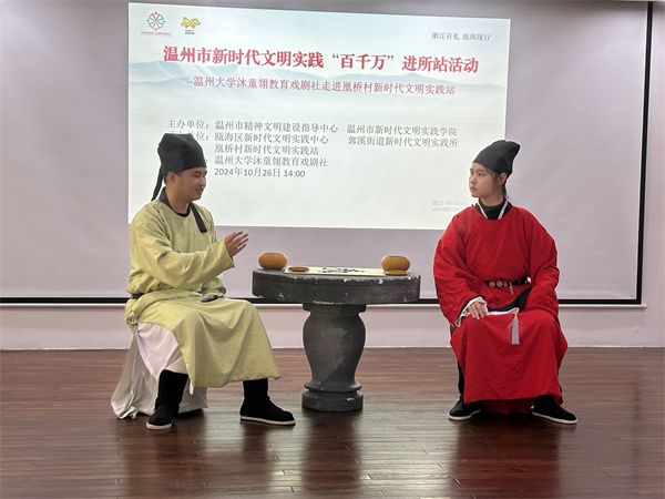 据悉,温大财神捕鱼 沐童翎教育戏剧团秉承师范教育传统,发挥学科专业优势,通过戏剧编创、制作和演出,多年来送戏进社区、进街道、进校园,是温大服务地方的生动诠释。几代社员精心打磨剧本,新生演员从台词磕巴到游刃有余,终将宋时雅韵再现于舞台。社团指导老师施星鸿表示,借助校地合作,学生通过戏剧表演和公益活动获得全面成长,又为当地村民展现传统文化的独特魅力,深化拓展新时代文明实践阵地建设。