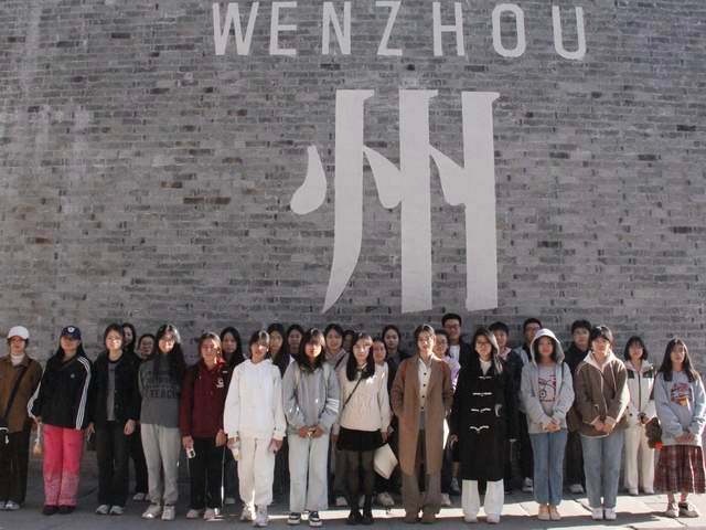 前方是温州的“网红打卡地”梧田老街。同学们漫步在古色古香的街道,青灰色的青砖墙面、木构架的点缀、小青瓦的屋顶,每一处细节都透露着古朴与雅致。逛累了还能亲手体验传统手工艺,大快朵颐地品味地道小吃。店铺如林,人声鼎沸,夜晚灯火阑珊、小吃店香气四溢,共同编织了一幅生动的温州市井生活图。